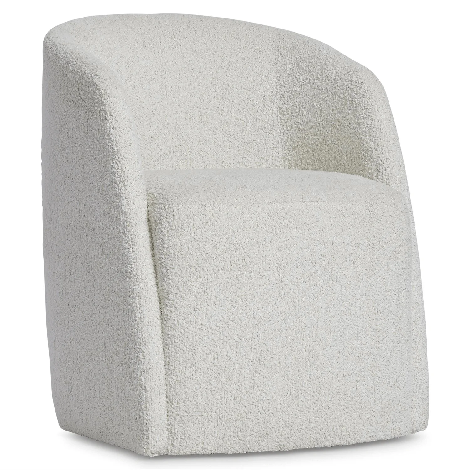 The Arcadia upholstered arm chair features an embracing back that curves around the seat for a sculptural look. The deep seat flows to the floor, and hidden casters offer smooth movement. A textural fabric adds visual impact to the neutral palette.