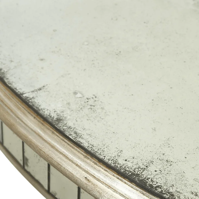 The turned, bulbous column and edge details are finished in Parisian silver, while the apron rail is inset with antiqued mirror tiles, above which there is a foxed mirror top.