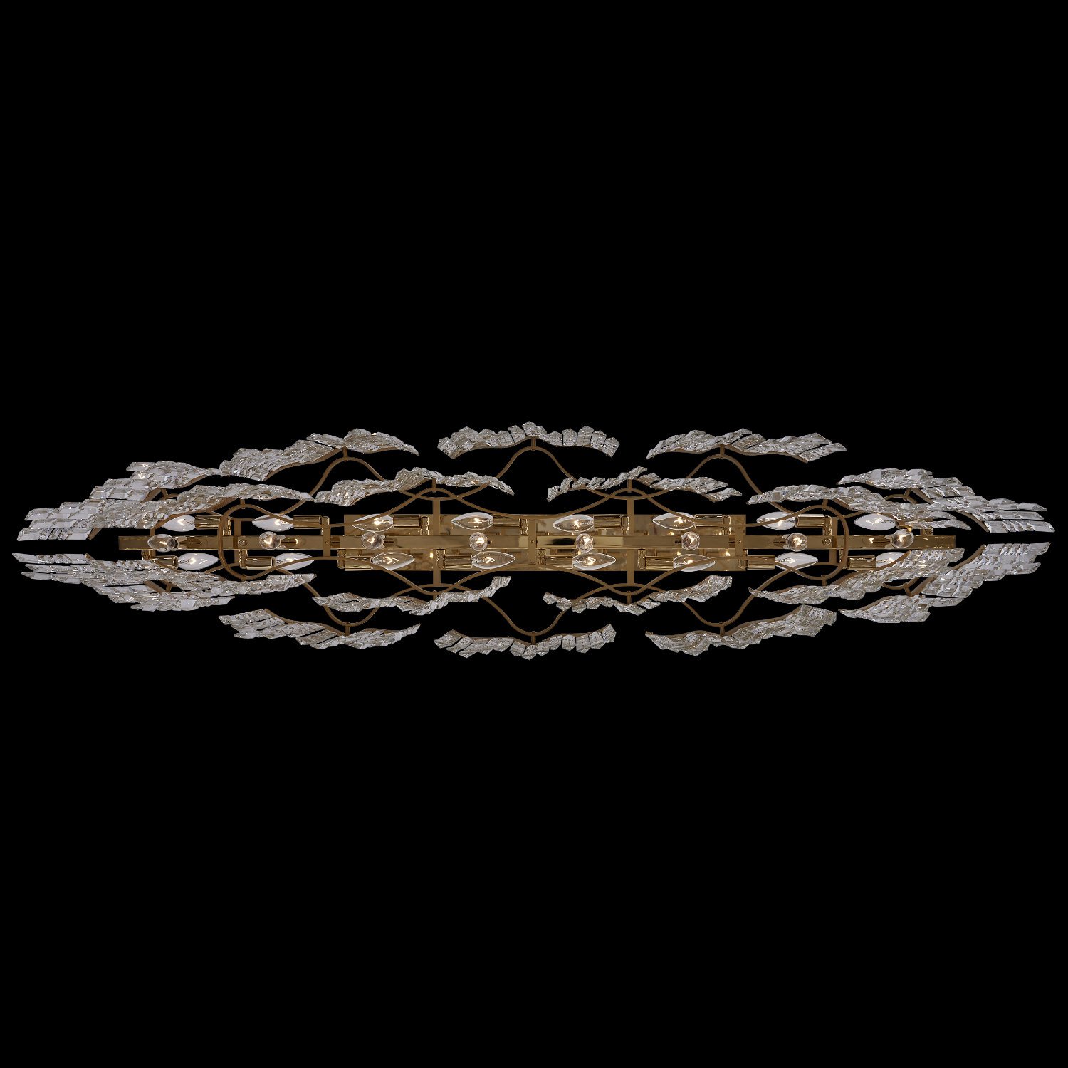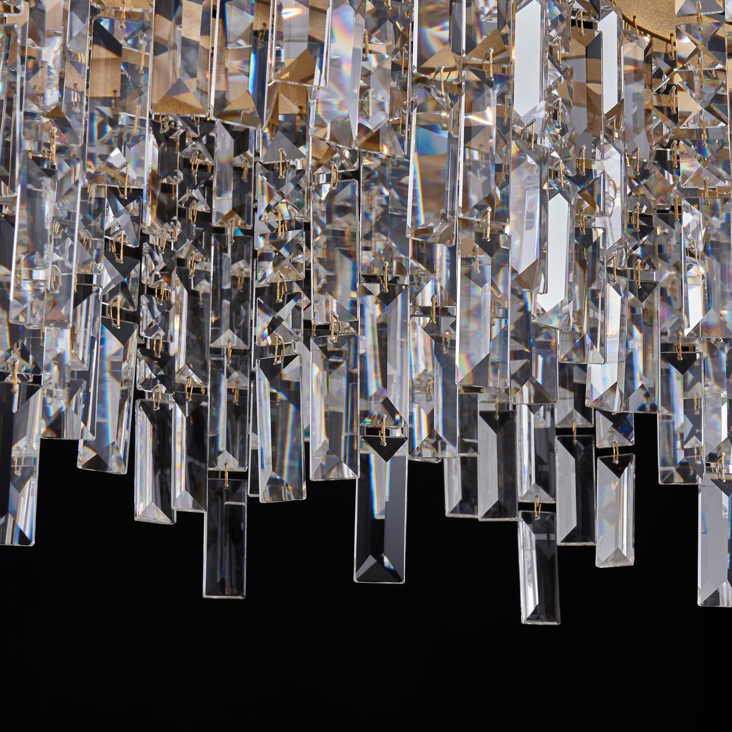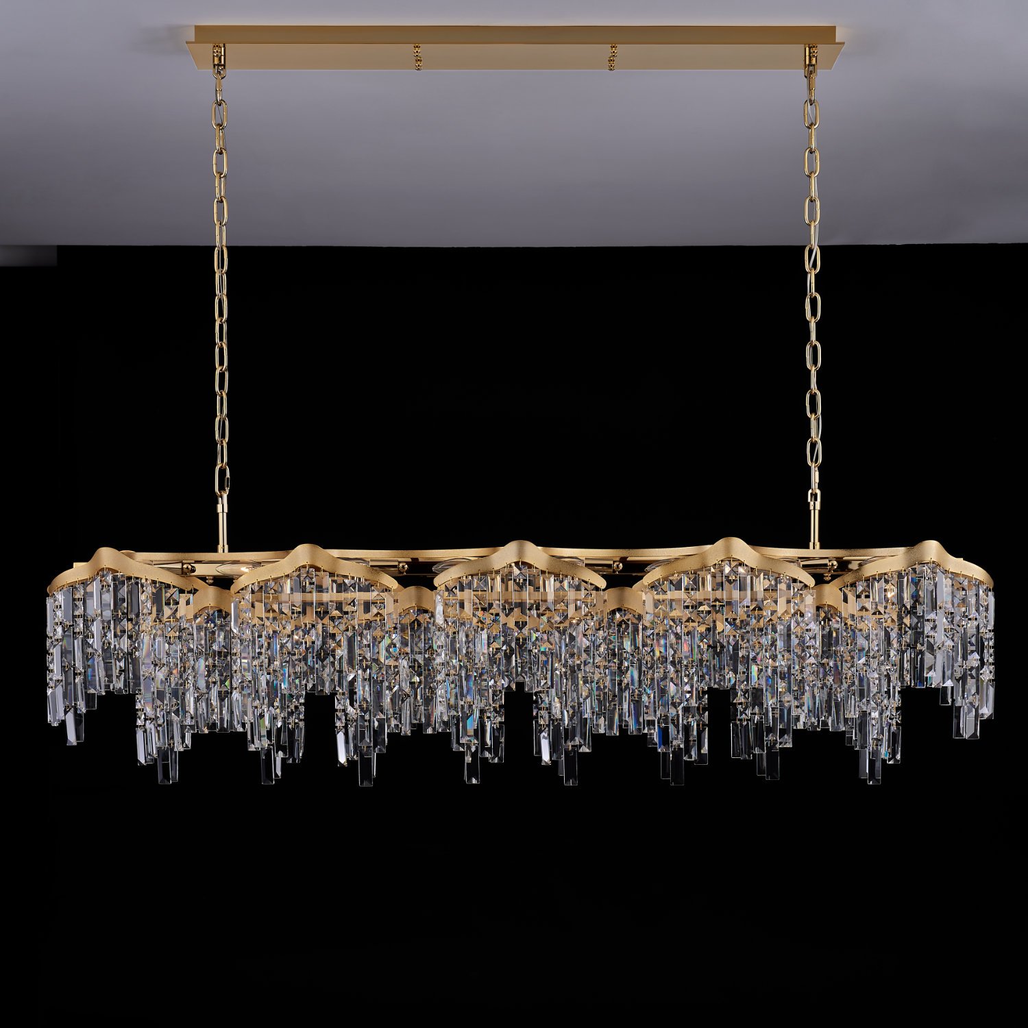 The Cadere Collection captivates the eye and sparks intrigue with its mesmerizing visual texture. Drawing inspiration from cascading waterfalls, this collection showcases vertical Firenze Crystals suspended from an undulating steel frame. Elegantly finished in gold, it is both stunning and thought-provoking.