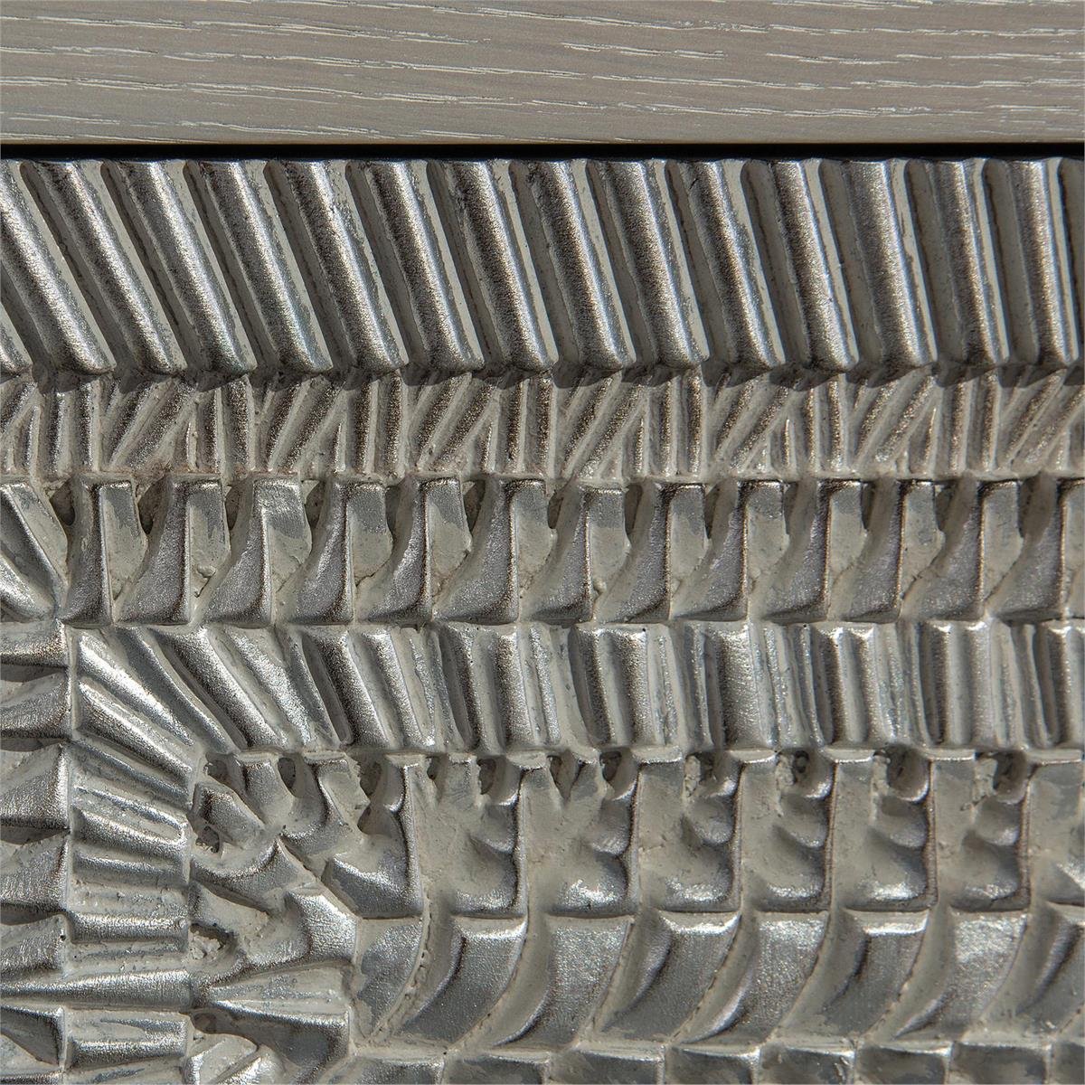 This two-drawer nightstand has drawer fronts with a Silver White, radiating pattern. They are set in a grey oak case.