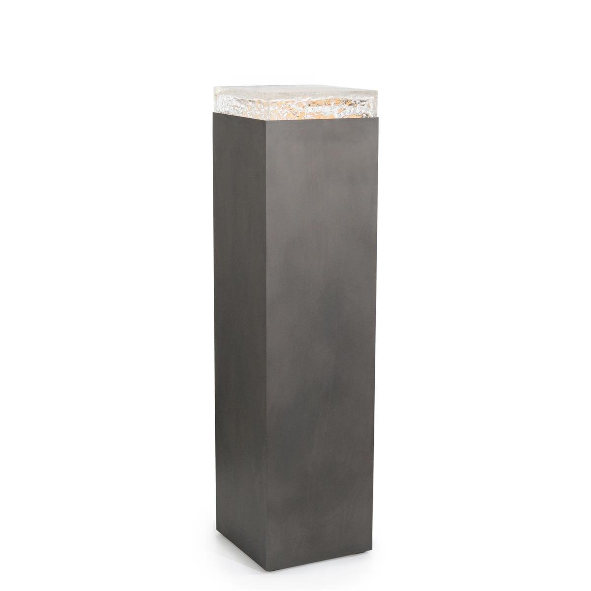 The Edda Pedestal showcases a chic, minimal profile that is greatly elevated by subtle textural interplay. The metallic body is adorned in a Gunmetal finish, beautifully contrasted against the icy look of a gorgeous clear acrylic tabletop. A stunning design accent on its own, the Edda can be placed alongside its many different variants to allow for creative custom arrangements. This piece is affixed with adjustable LED lighting and a dimmer switch.
