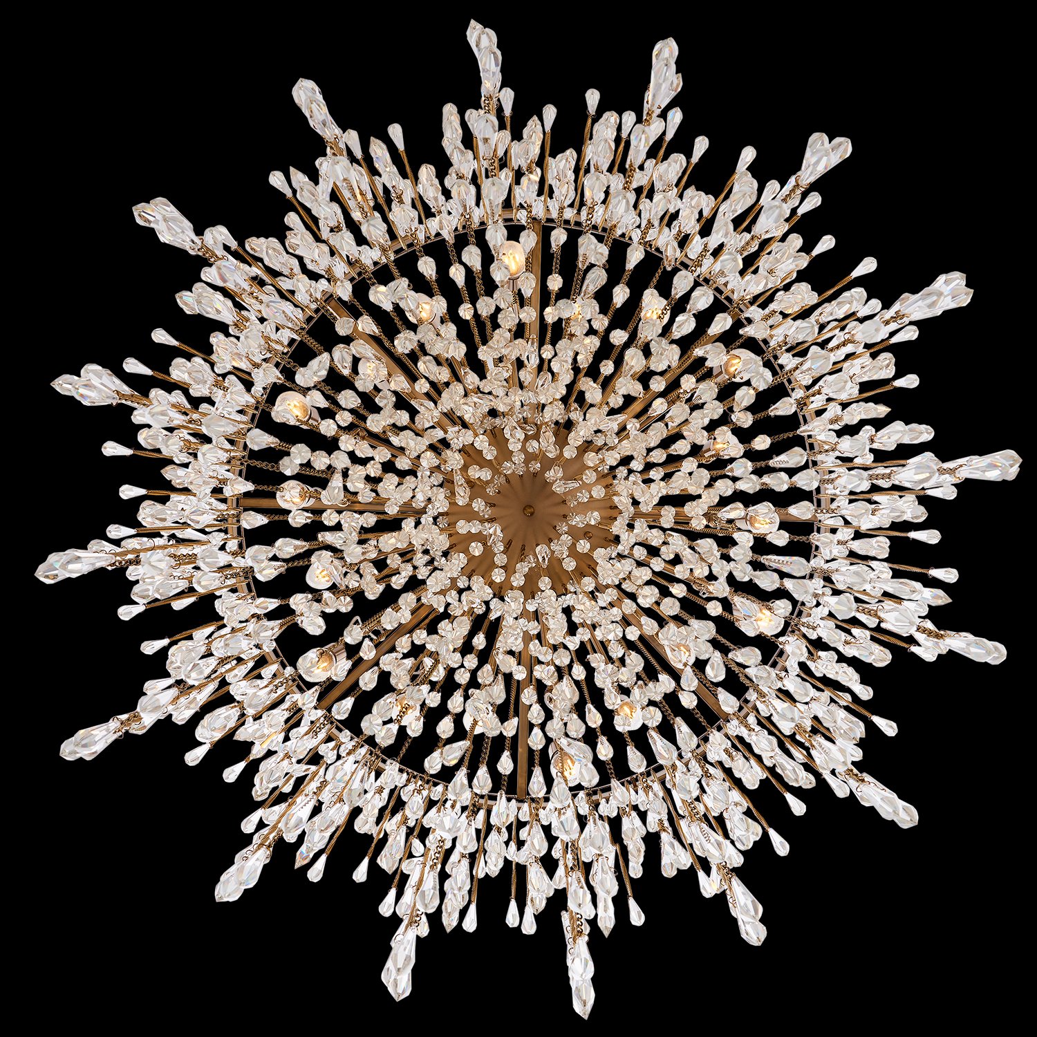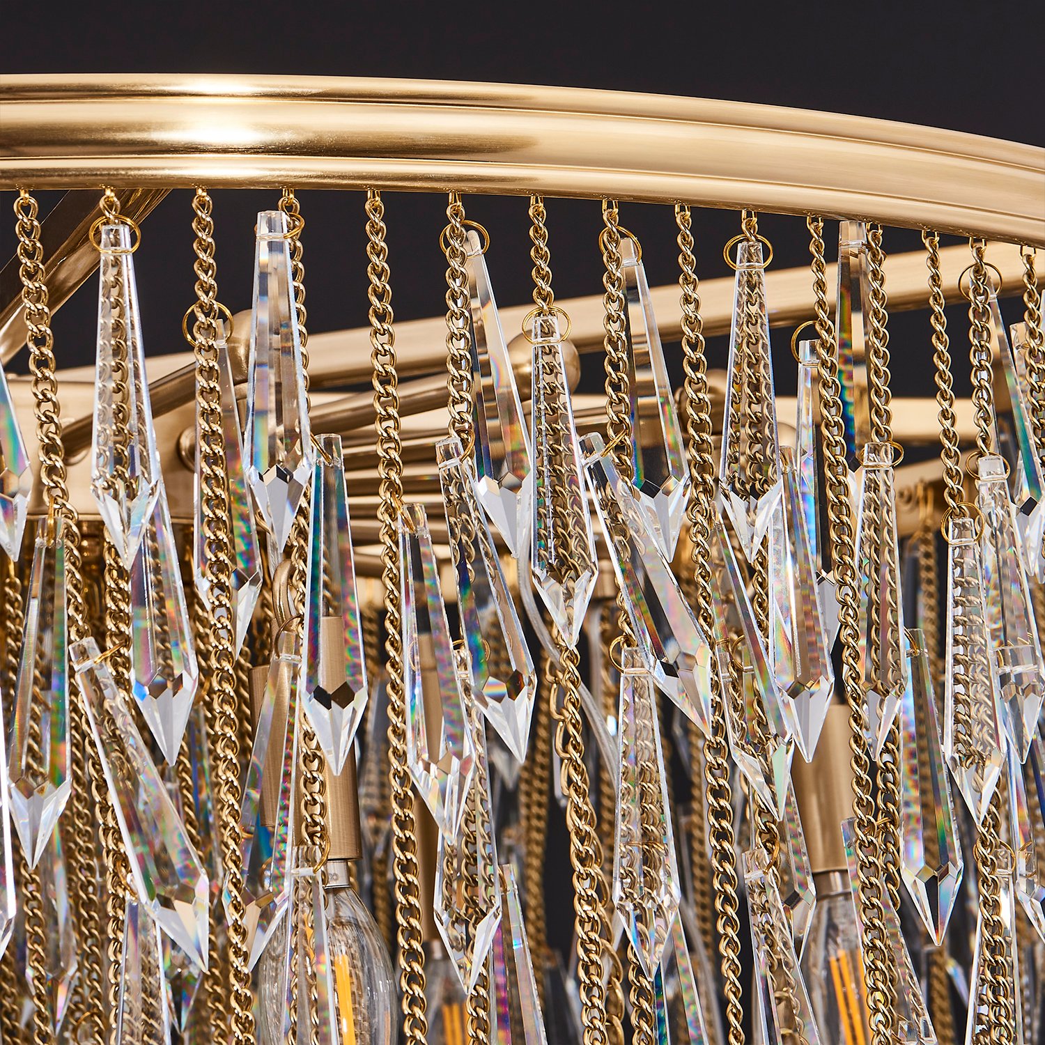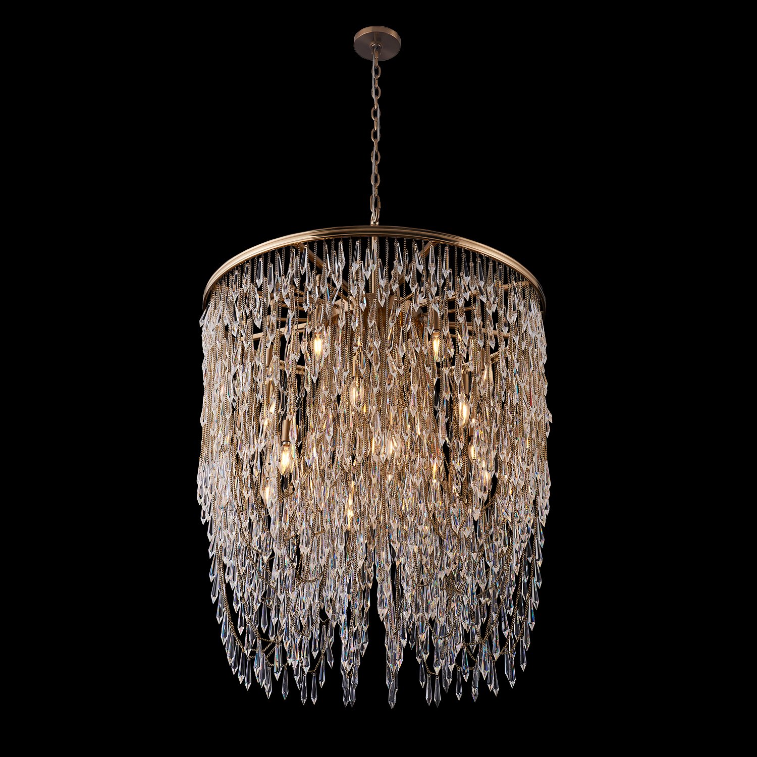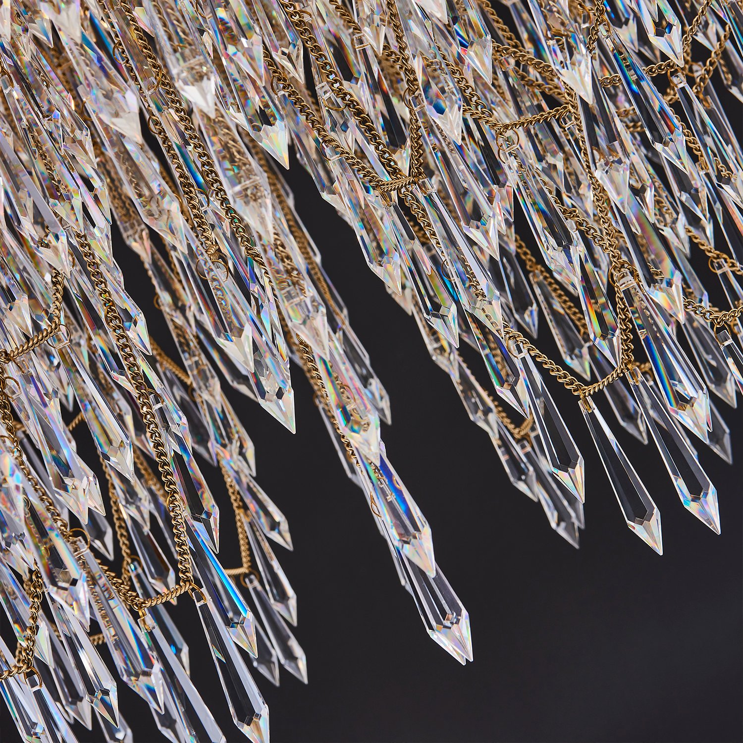 Organized randomness of fringe draping and gravity creates the shape of the Frangia collection of lighting. Champagne Gold chains act as the support for the crystal spears for a boho glam vibe.