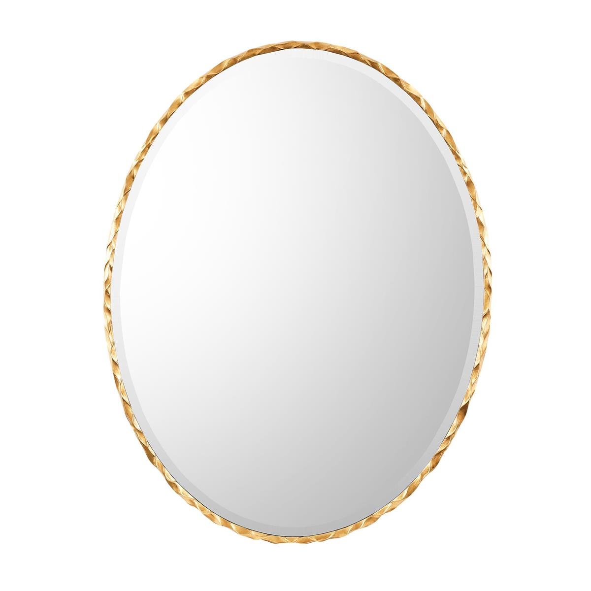 The Gilded Loop Mirror is a stylish addition to any interior space. An ovate, beveled mirror is surrounded by a beech wood frame with textural detailing in a Gold Coast finish. This piece is affixed with French cleats and may hang in both vertical and horizontal orientations.