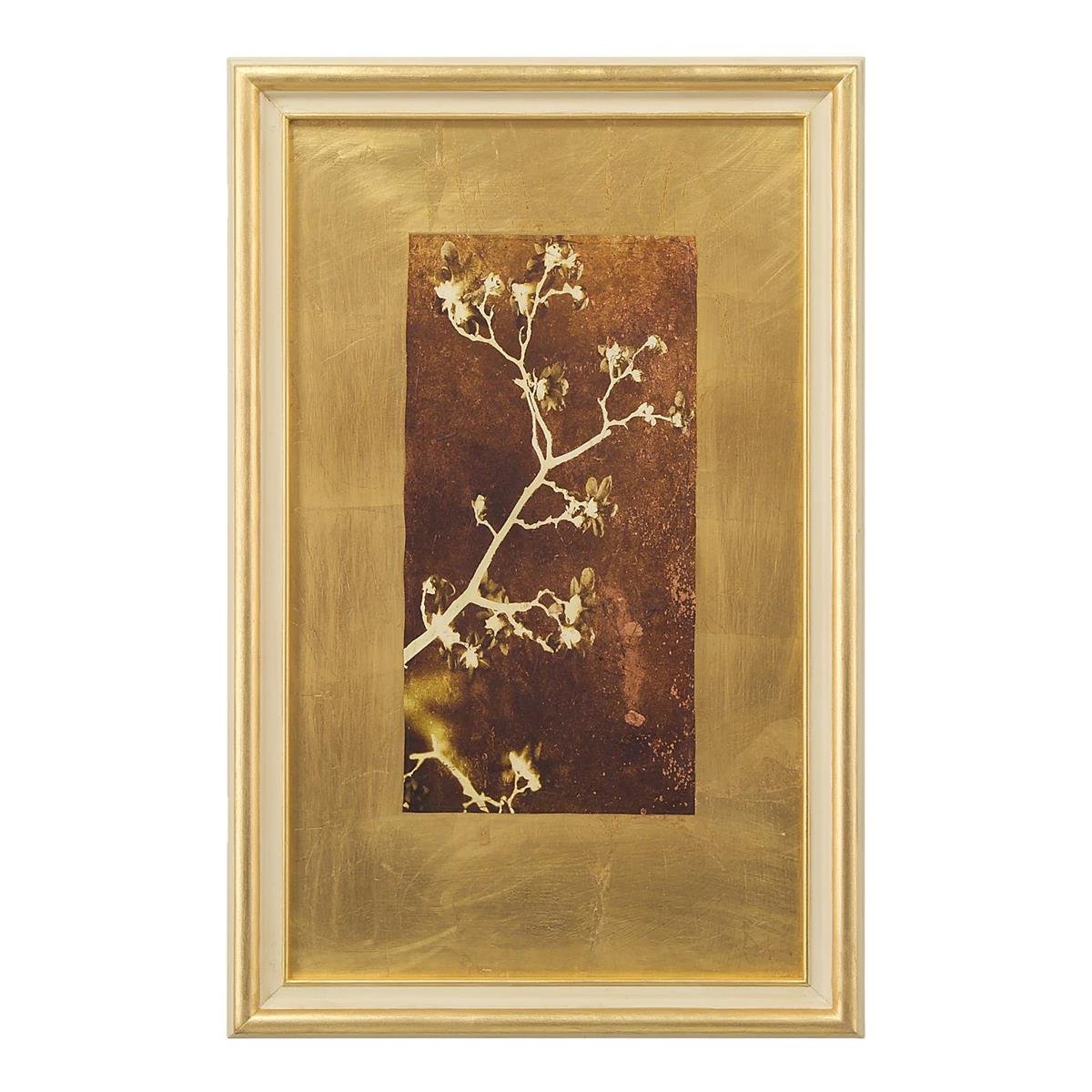 The simple image of branches with white blossoms takes a sophisticated turn with hand-finishing and a wide border of glowing gold metal leaf. The wooden molding is also hand-finished in ivory gesso and gold leaf.