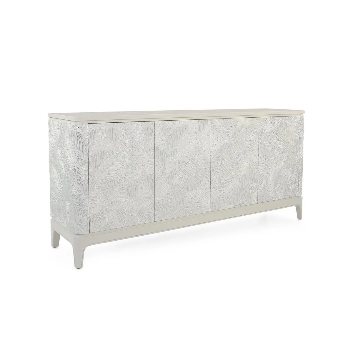 The Ivory Palms Credenza is a naturally inspired statement piece that infuses a space with subtle hints of the outdoors. Crafted from beech wood in a Silver Beluga finish, the sides and four push latch doors showcase a textural arrangement of flowing leaves. The base with four legs showcases an Ivory finish, matching the tabletop to complete the look. This gorgeous credenza features three interior compartments, each with an adjustable shelf.