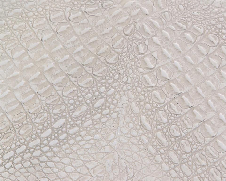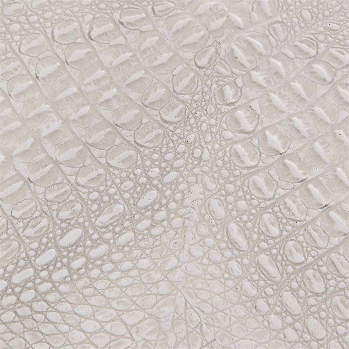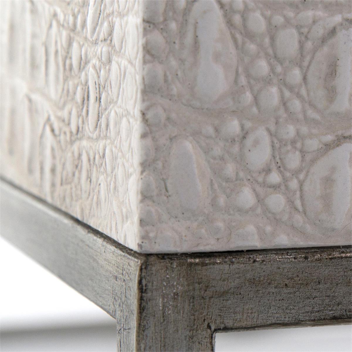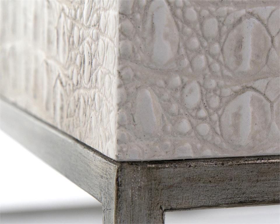 Mounted on a simple metal-framed base in a textured finish in Silver White, the top of the Kano cocktail table features a book-matched crocodile pattern in textured resin finished in variegated tones of cream and white.