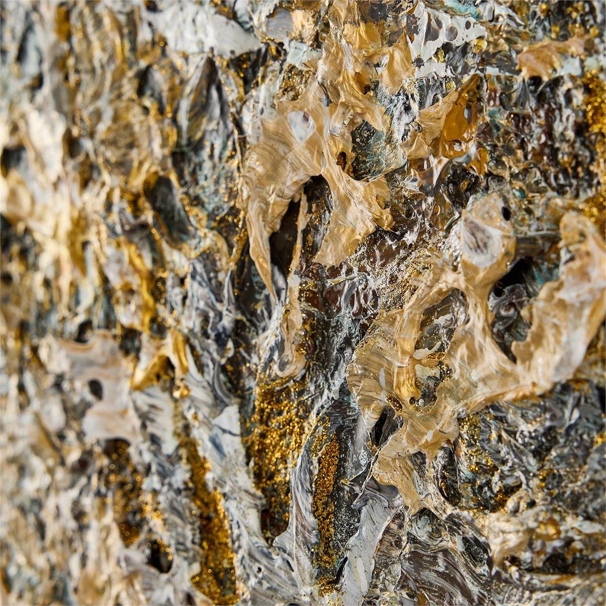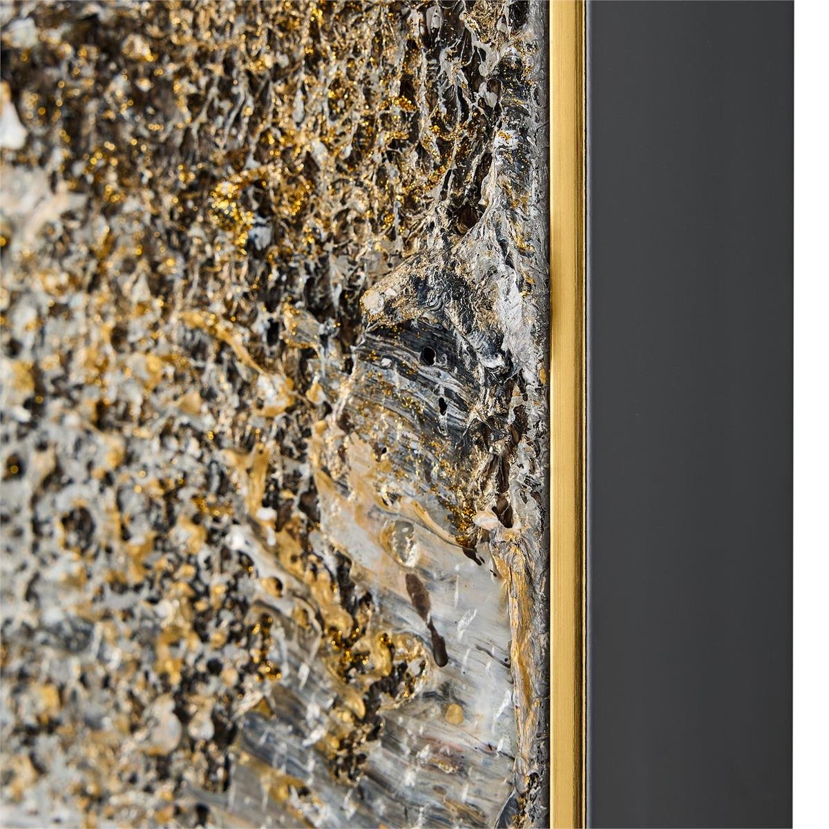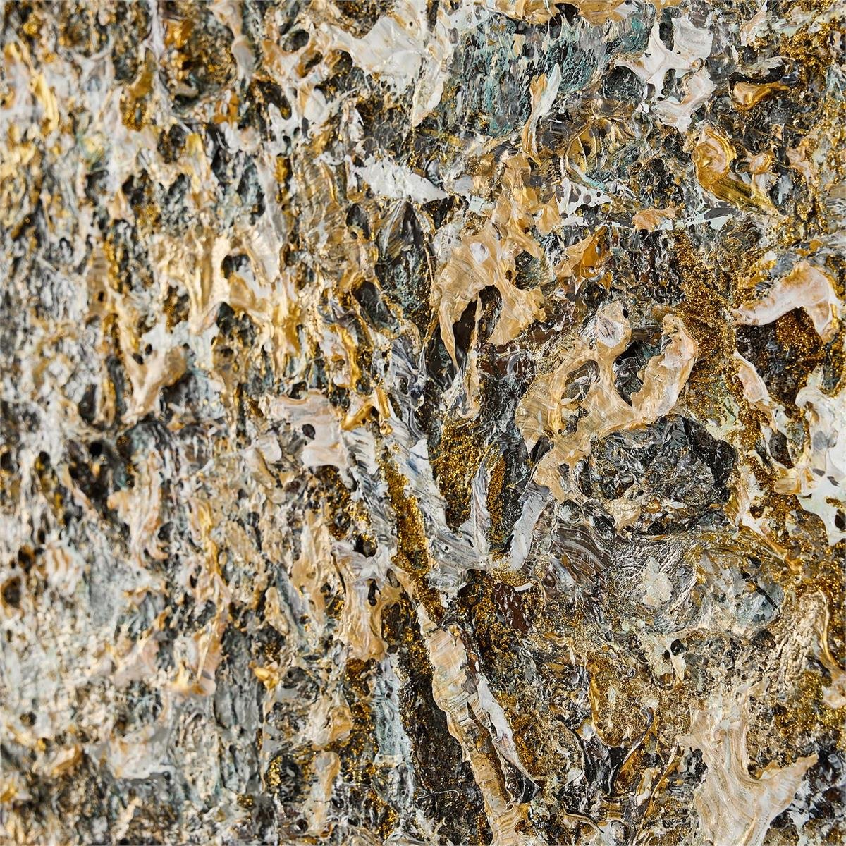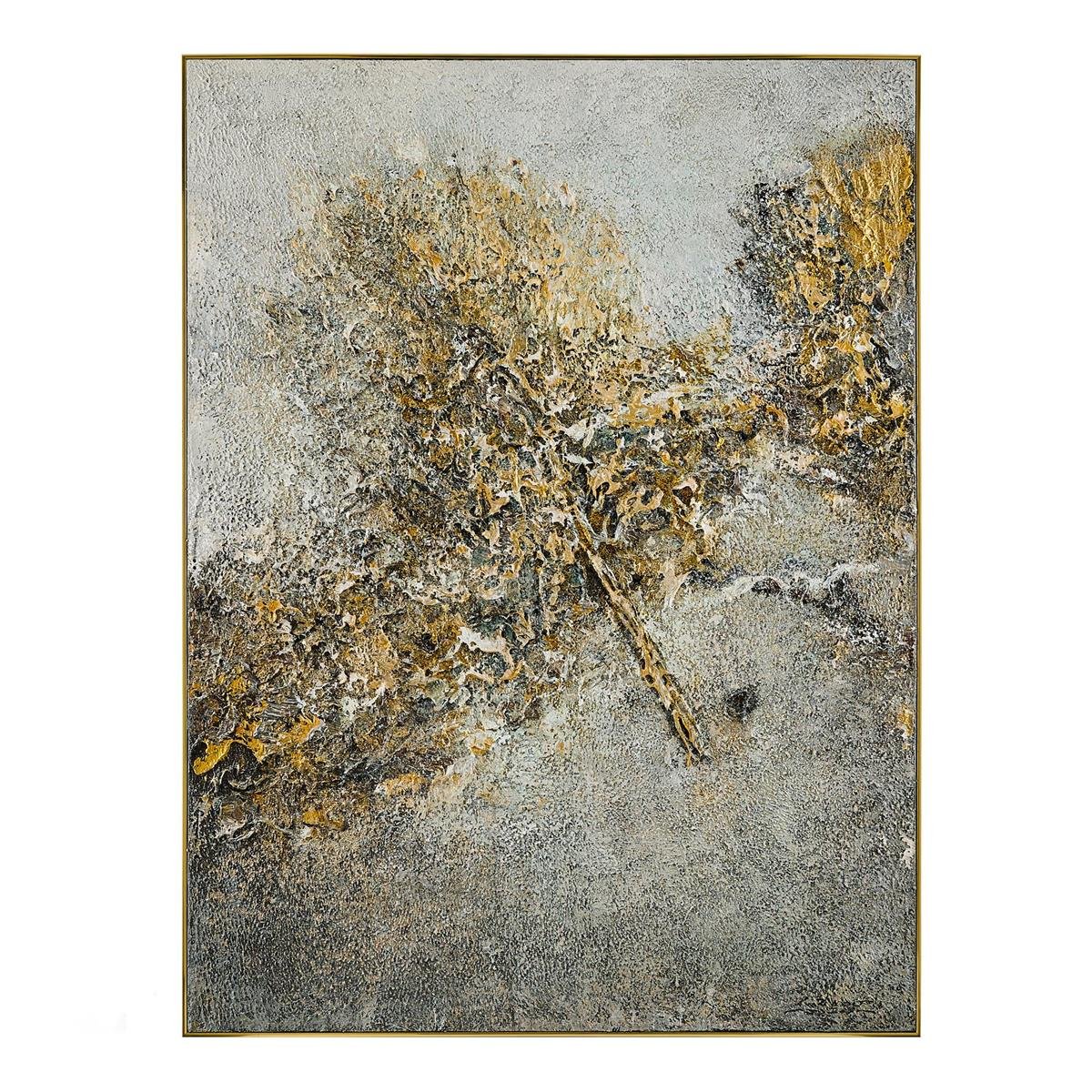 Gleaming Mist by artist LM Zhou is a stylish design statement realized in acrylic paint on canvas. The painting depicts textural golden tones floating amongst a misty background in varying shades of gray. This elegant work of art is held within a gold gallery frame and may only be displayed in a vertical orientation.
