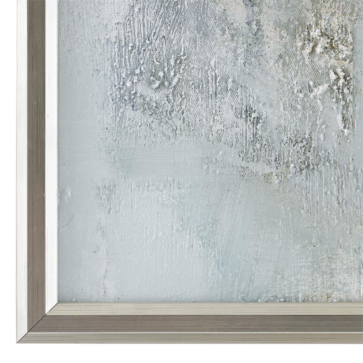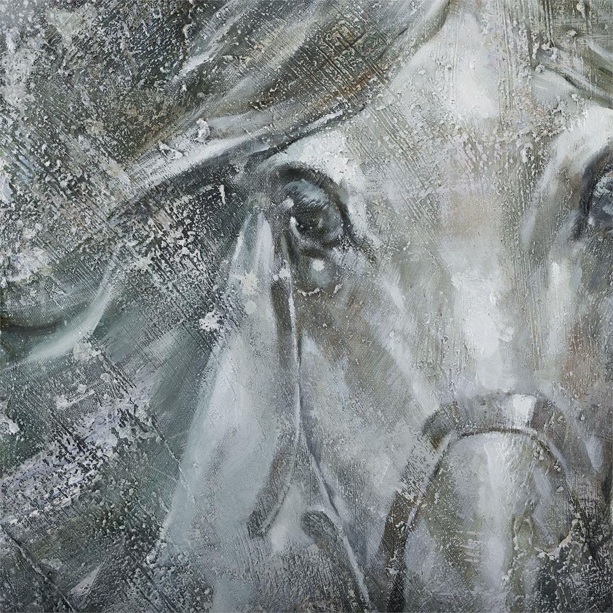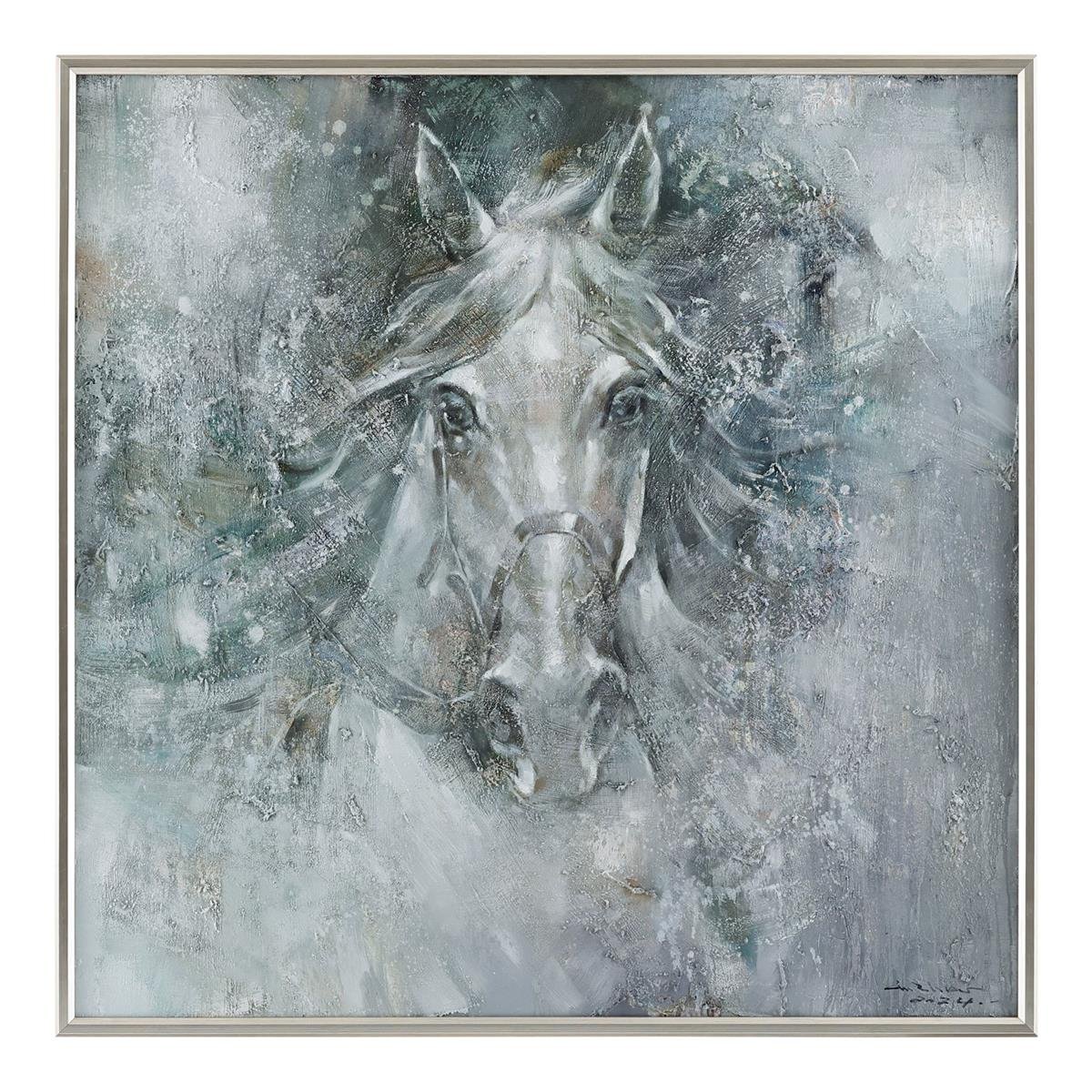 Starlit Stallion by artist LM Zhou is an oil painting on canvas that features a majestic white horse surrounded by misty black and gray tones. This gorgeous artwork is displayed from a silver gallery frame.
