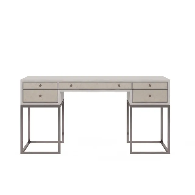+ Free ShippingVintage elegance meets contemporary chic in this attractive writing desk, highlighting the angular geometry and warm antiqued mirror details that are the hallmark of this collection. The desk is veneered in maple with a dove gray finish and rests on an open metal base, with five drawers that provide convenient storage space for all your office essentials. Or showcase this piece in the bedroom to create a glamorous makeup vanity.