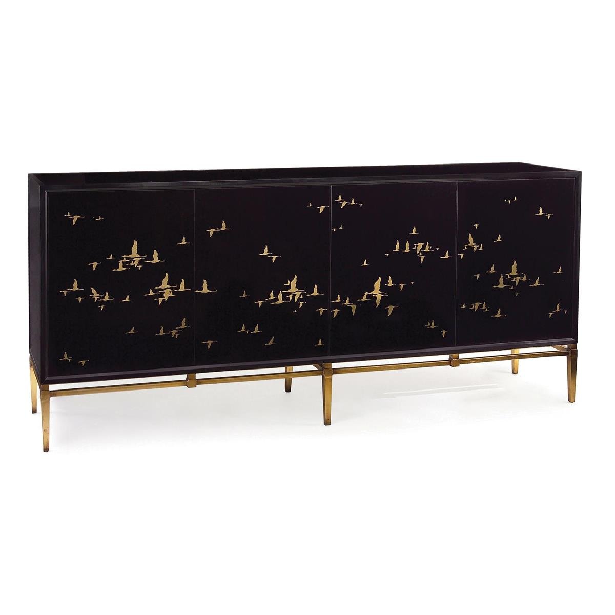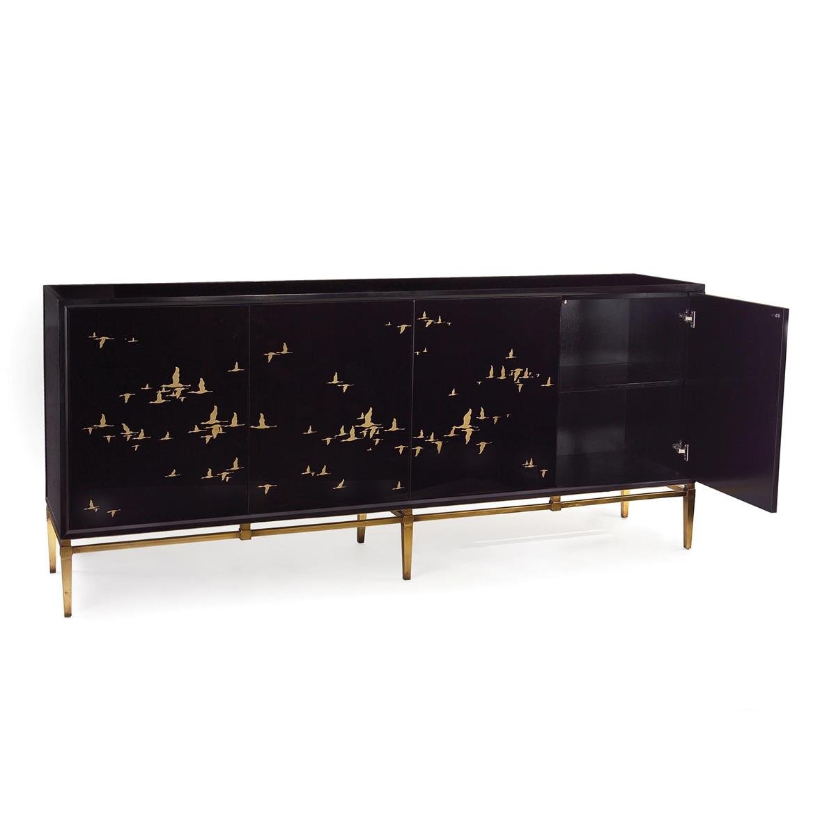 The gold migrating birds are reverse-painted on black glass. The credenza has a black glass top and sides and is mounted on a six-legged frame finished in old gold.