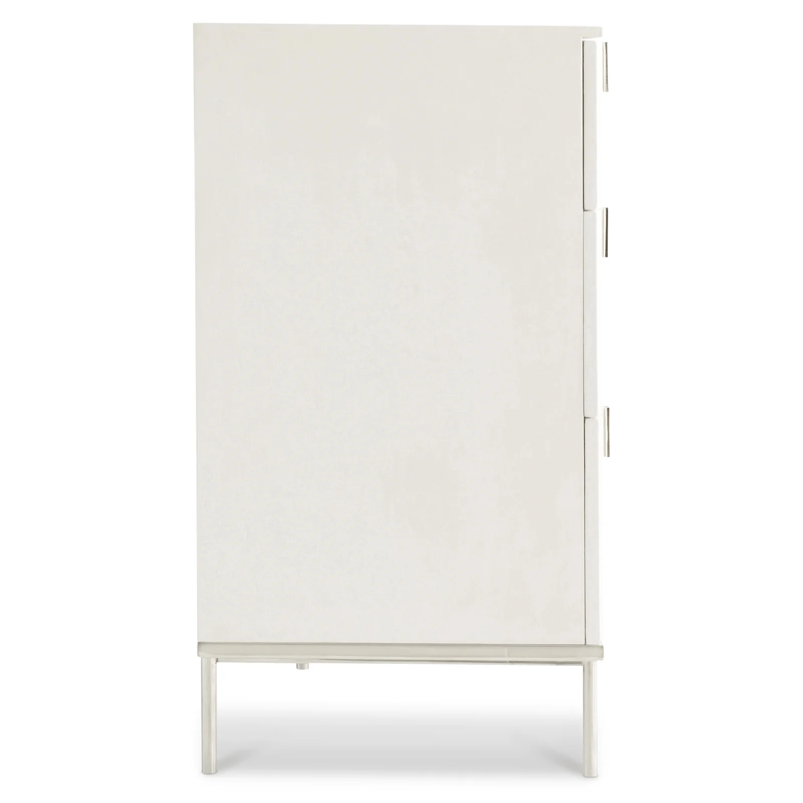 A quietly elegant dresser features cast resin fluted drawer fronts and a stainless steel base.