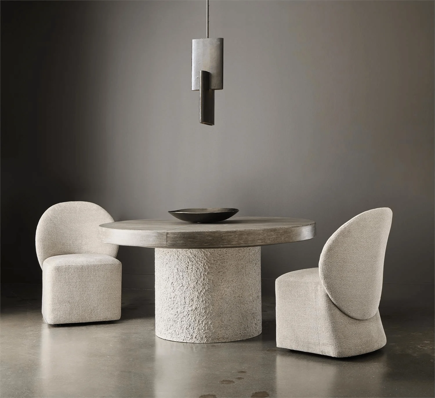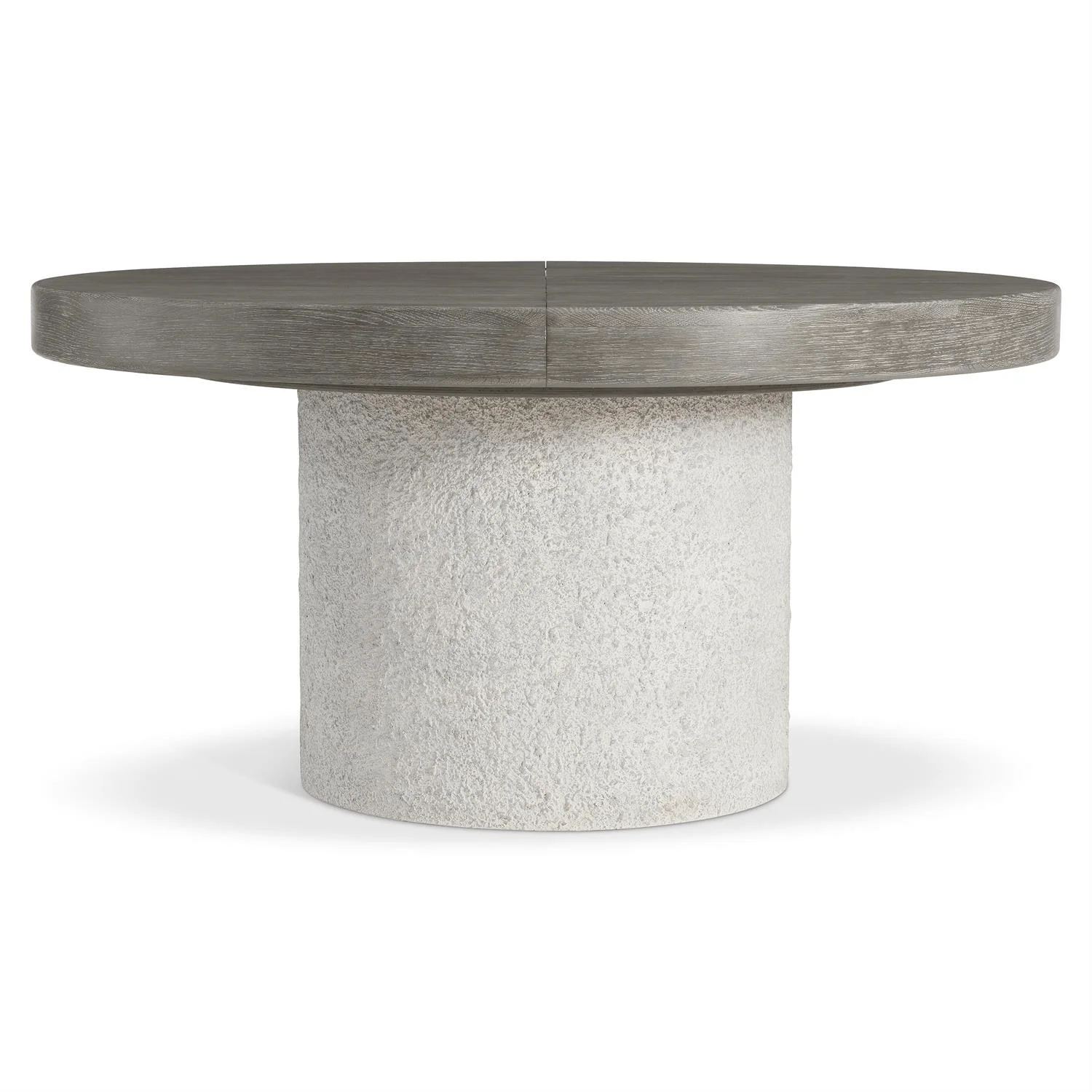 Monolith Dining Table – Sculptural and versatile, the Monolith table features a textured faux stone pillar base in Millstone finish. The round wood top in Puma finish extends to an oval with one leaf, blending modern elegance with functional design.