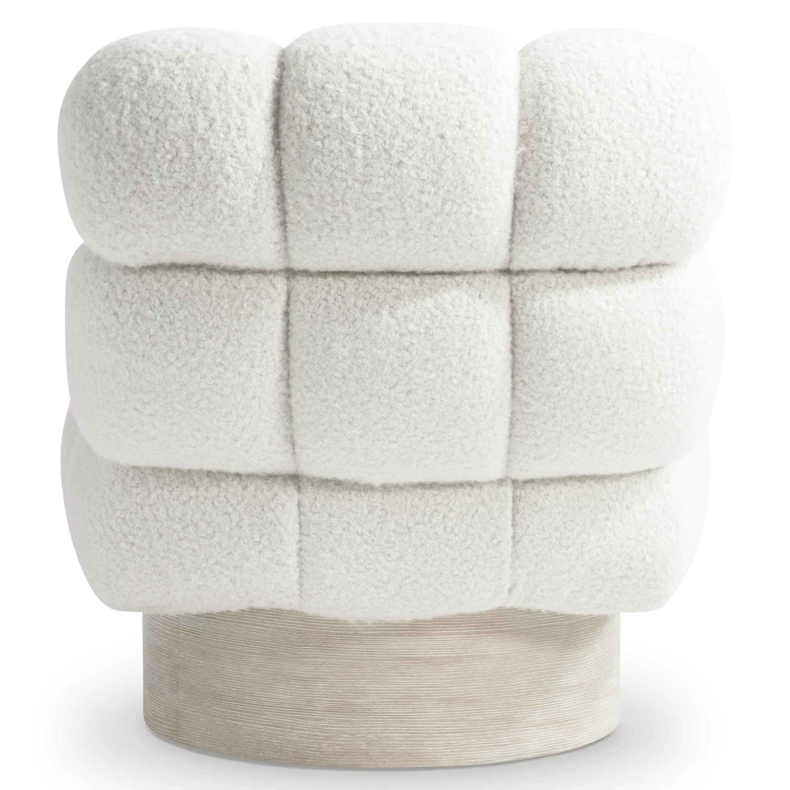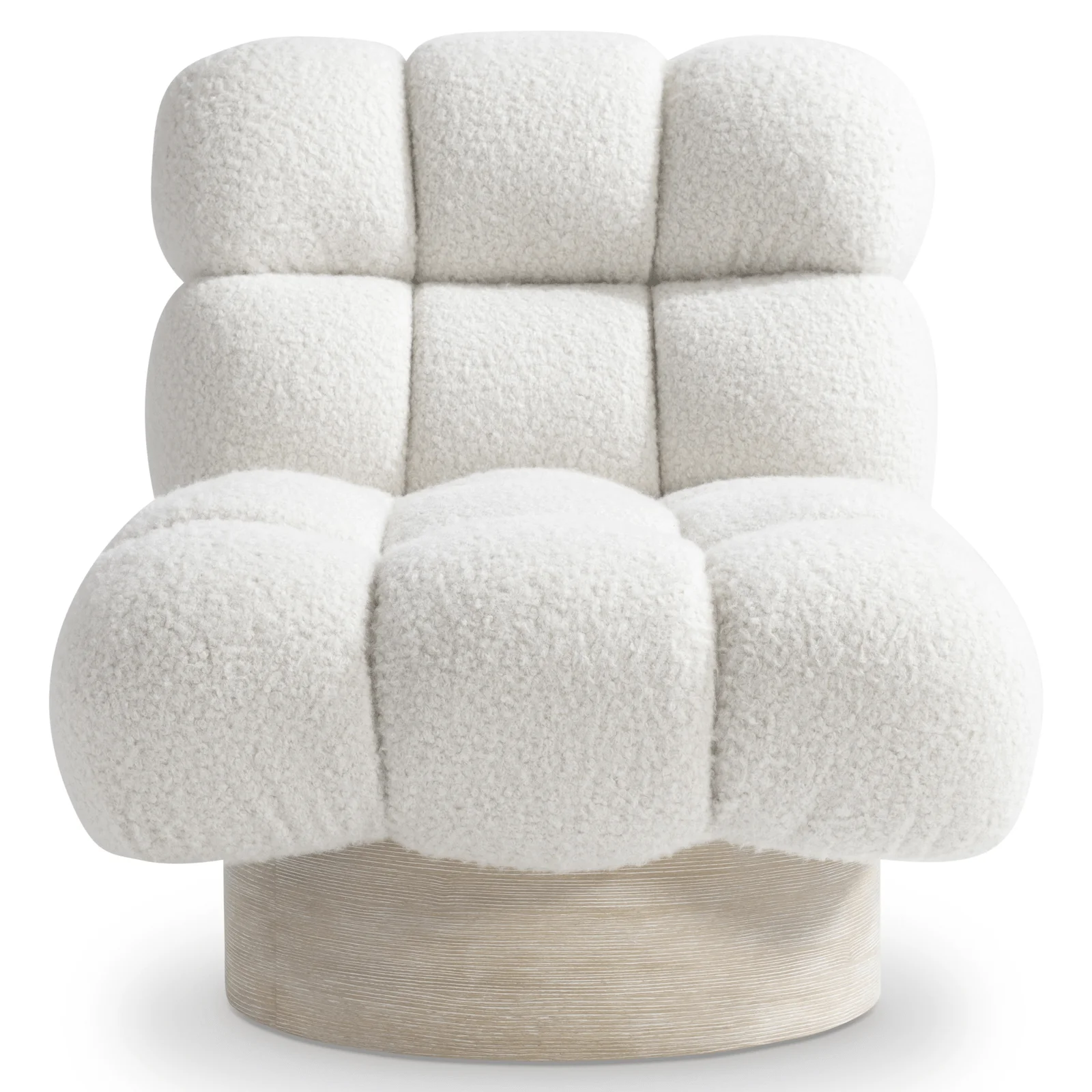 Deep biscuit tufting and a wooden base give this swivel chair a distinctive modern style.