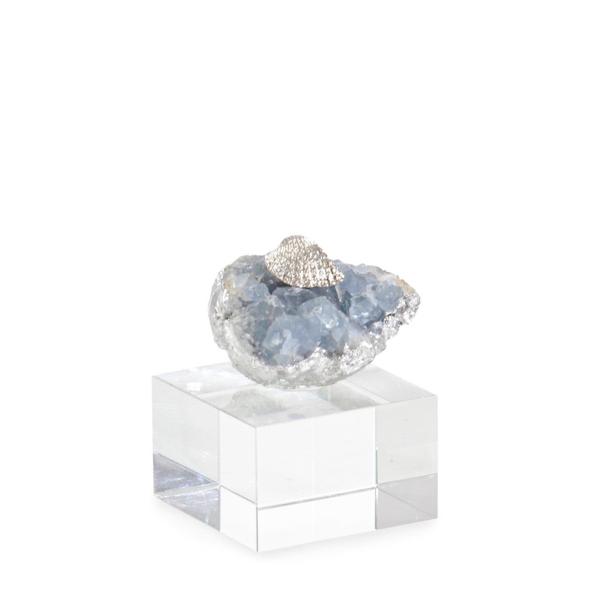 A celebration of the ocean’s natural beauty, the Ocean Floor Sculpture on Crystal Base features a rugged blue stone that nests within a bed of brass in a nickel finish. A small conch shell rests gently on top of the stone, with a large block of clear acrylic introducing transparent hues and smooth lines to the organically shaped piece.