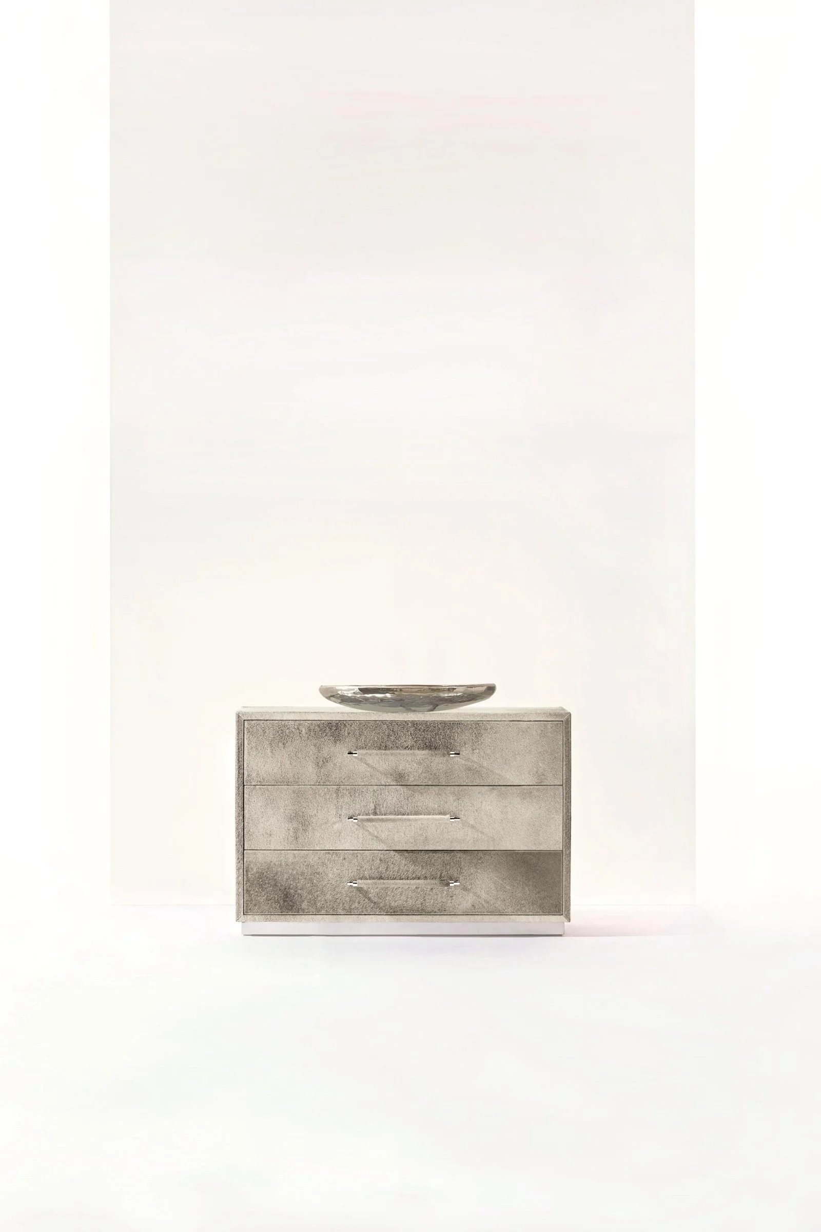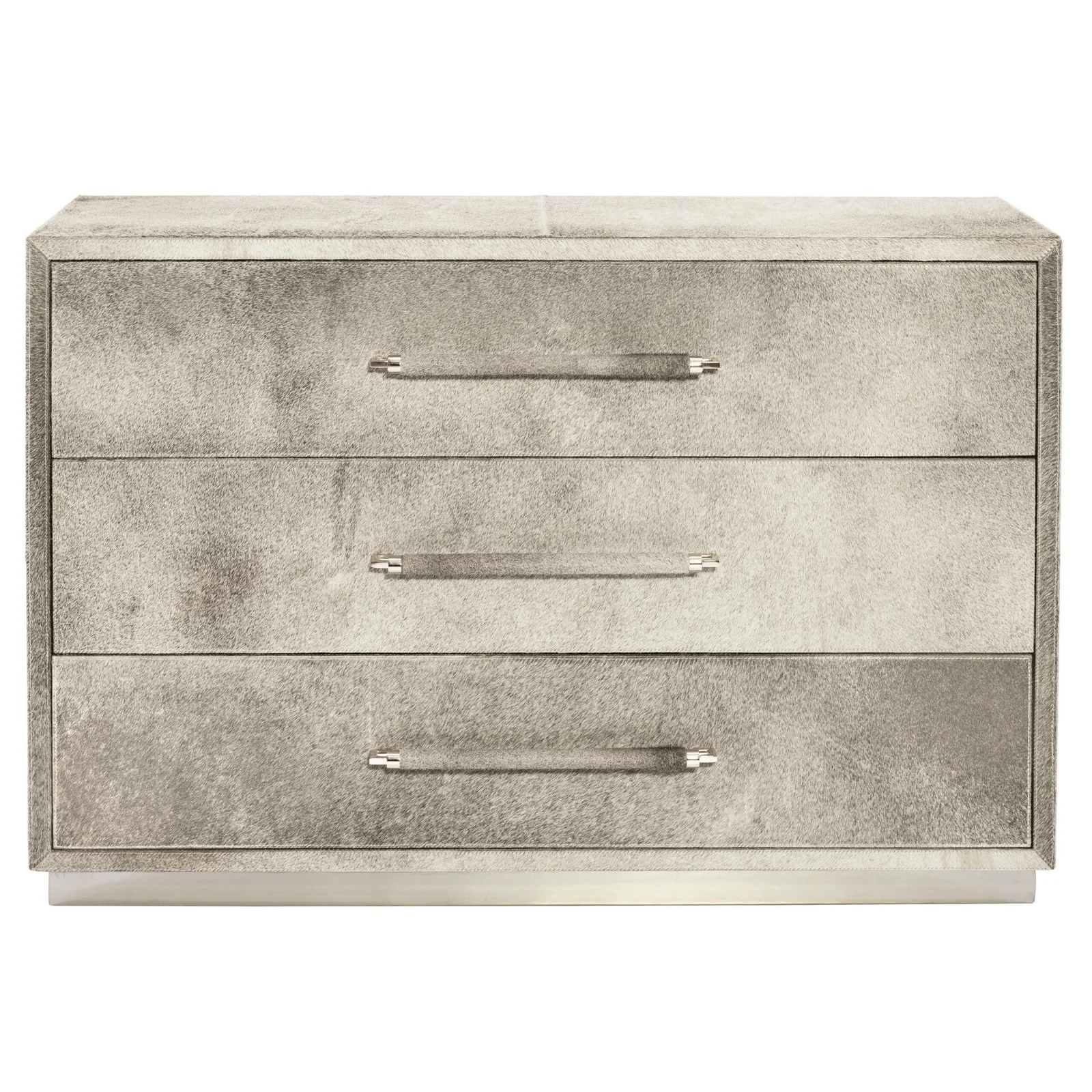 Full of texture and character, this luxe drawer chest features gray hair-on-hide covering with saddle stitching.