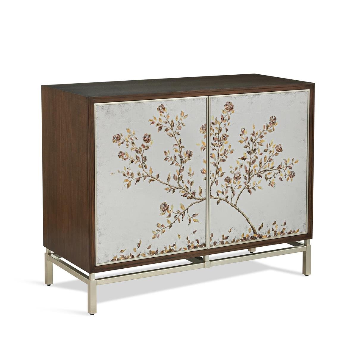 The Petalvale Two-Door Cabinet enhances an interior space with gorgeous natural motifs. Crafted from ash wood in a Monopoli finish, the deep brown tones of the body are tastefully juxtaposed against a stylish steel base in Champagne Silver. Two push-latch doors feature an elegant tree with detailed flora, reverse painted on glass with a light, distressed look over a silver églomisé backdrop. The cabinet features a single interior compartment with one adjustable shelf.