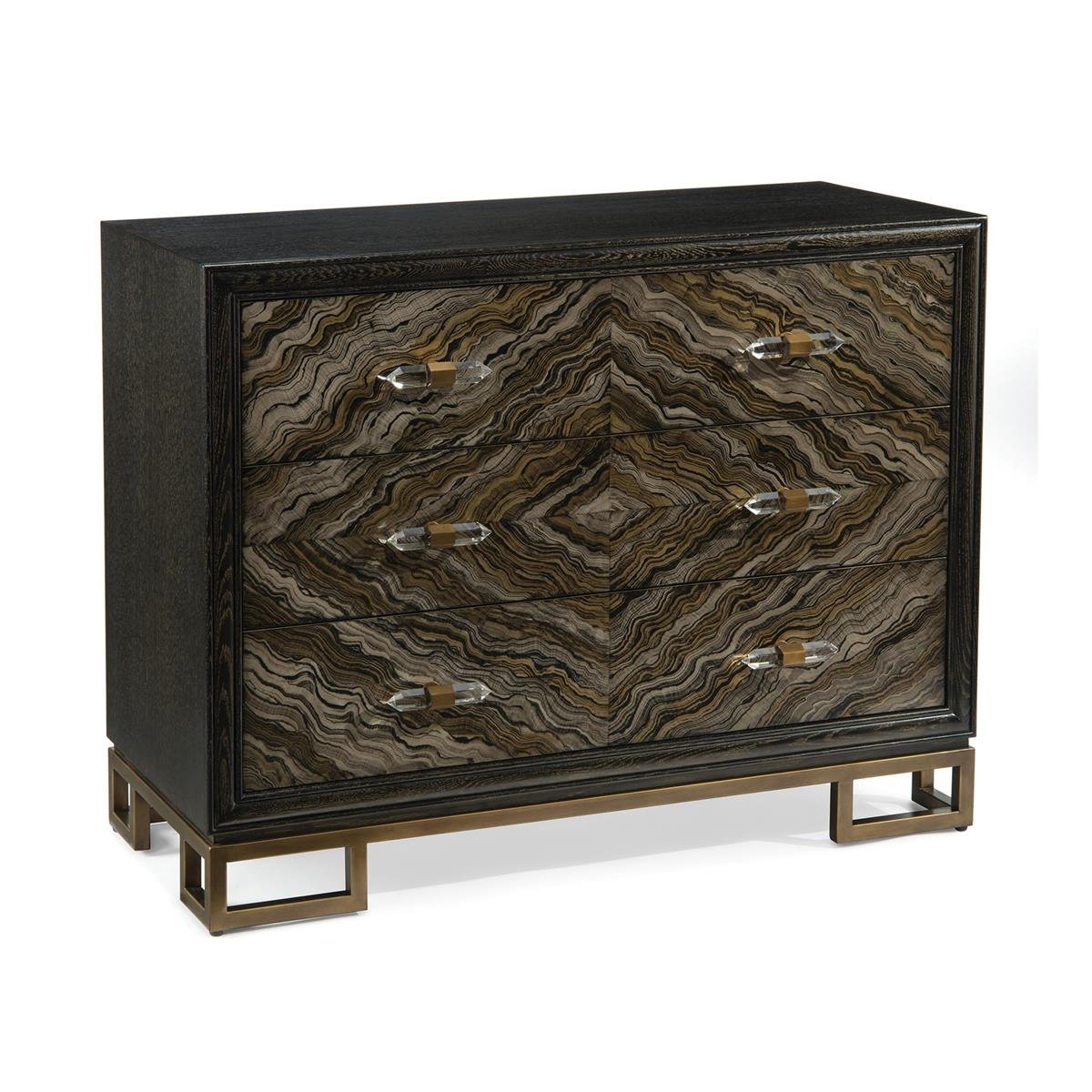 A three-drawer oak chest in black has gold cerusing. The drawer fronts are a hand-painted faux marble pattern of taupes and gold, furnished with brass and crystal prism-shaped handles. The case is set on a steel base finished in antique brass.