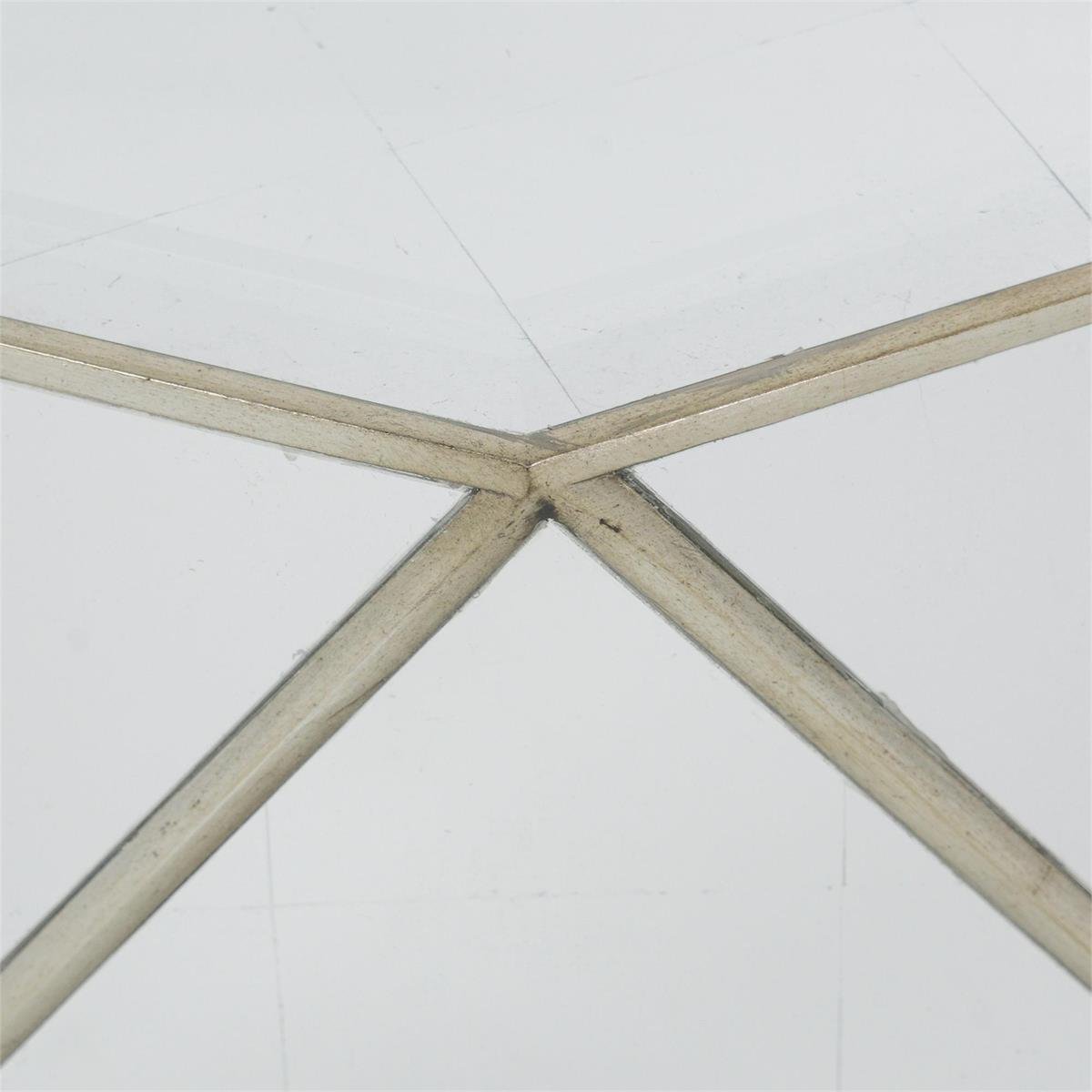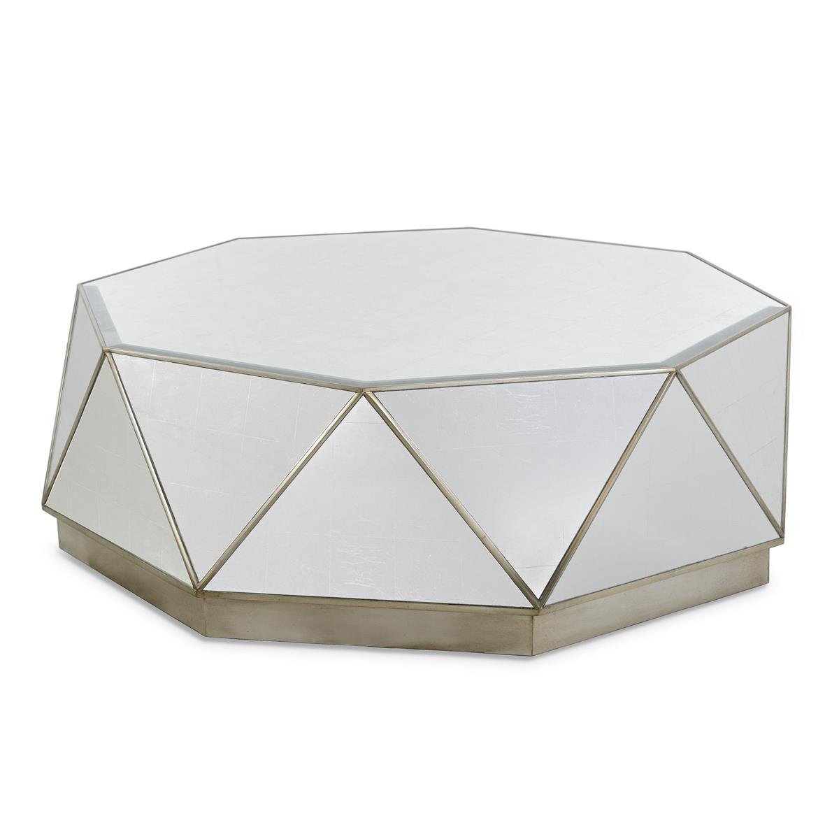 This contemporary cocktail table features faceted eglomise mirror surfaces. The sparkling eglomise is accented with a plinth base in Burnished Silver Leaf. Matching Piece