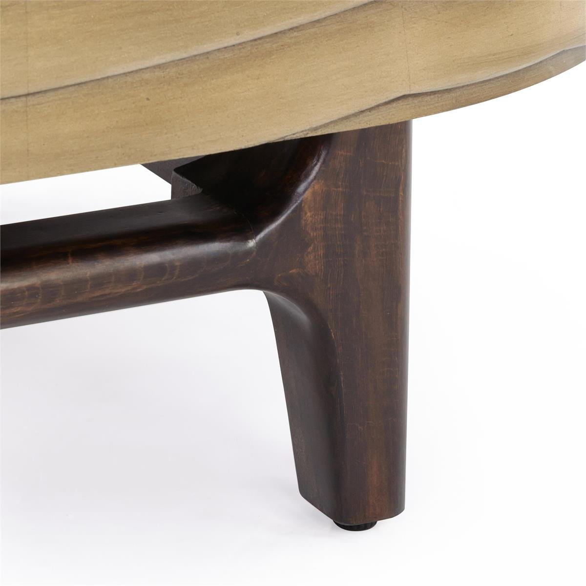 The Radiant Waves Four-Door Sideboard is a beautifully designed piece that elevates any space with a bold sense of motion. The tabletop and sculptural base are crafted from eucalyptus wood in a Light Smoked Eucalyptus finish. Natural wood tones are juxtaposed against dimensional, overlapping waves in Parisian Brass across four push-latch doors. The interior features a black tone, equipped with a single central compartment and two outer compartments, each with a fixed shelf.