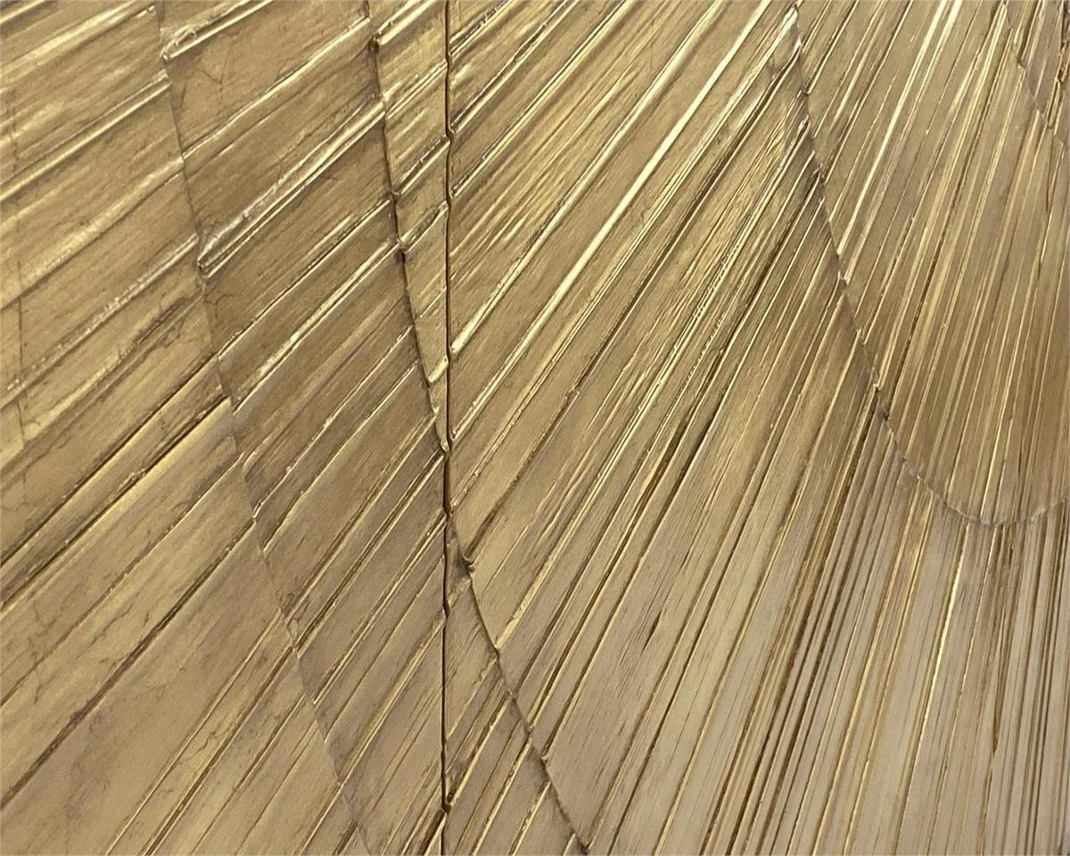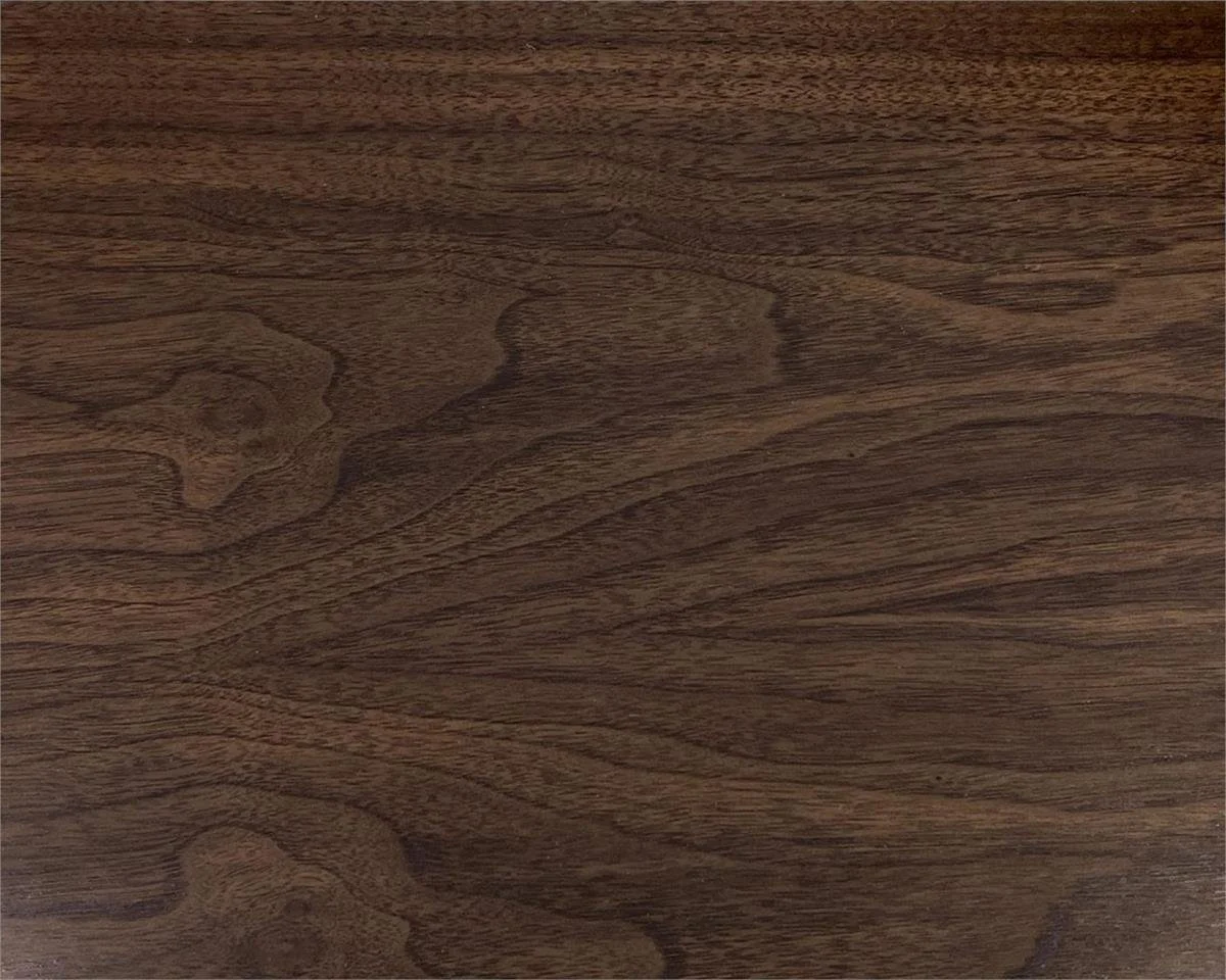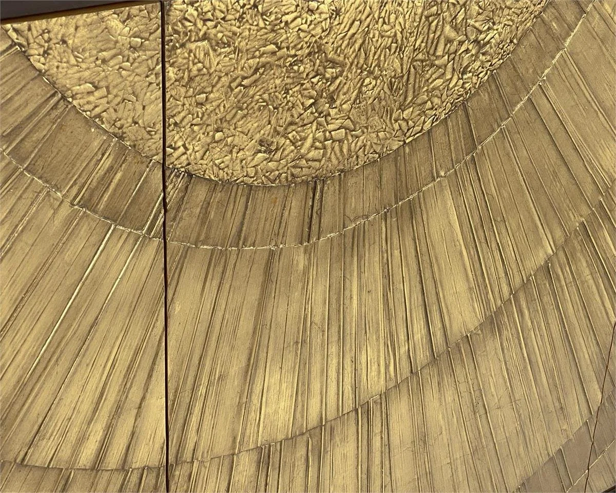 Set in an American Black Walnut case, the four doors of this sideboard feature an offset radiating pattern in a Gold Coast finish.
