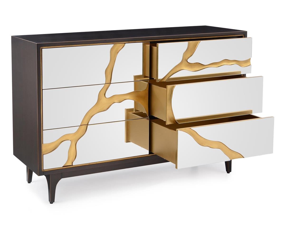 This six-drawer chest features modern beveled mirror fronts with an inset ravine pattern in a gold finish. The cabinet and base are finished in smoked oak.