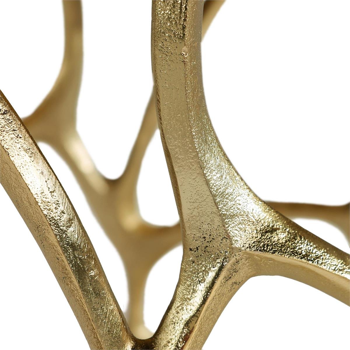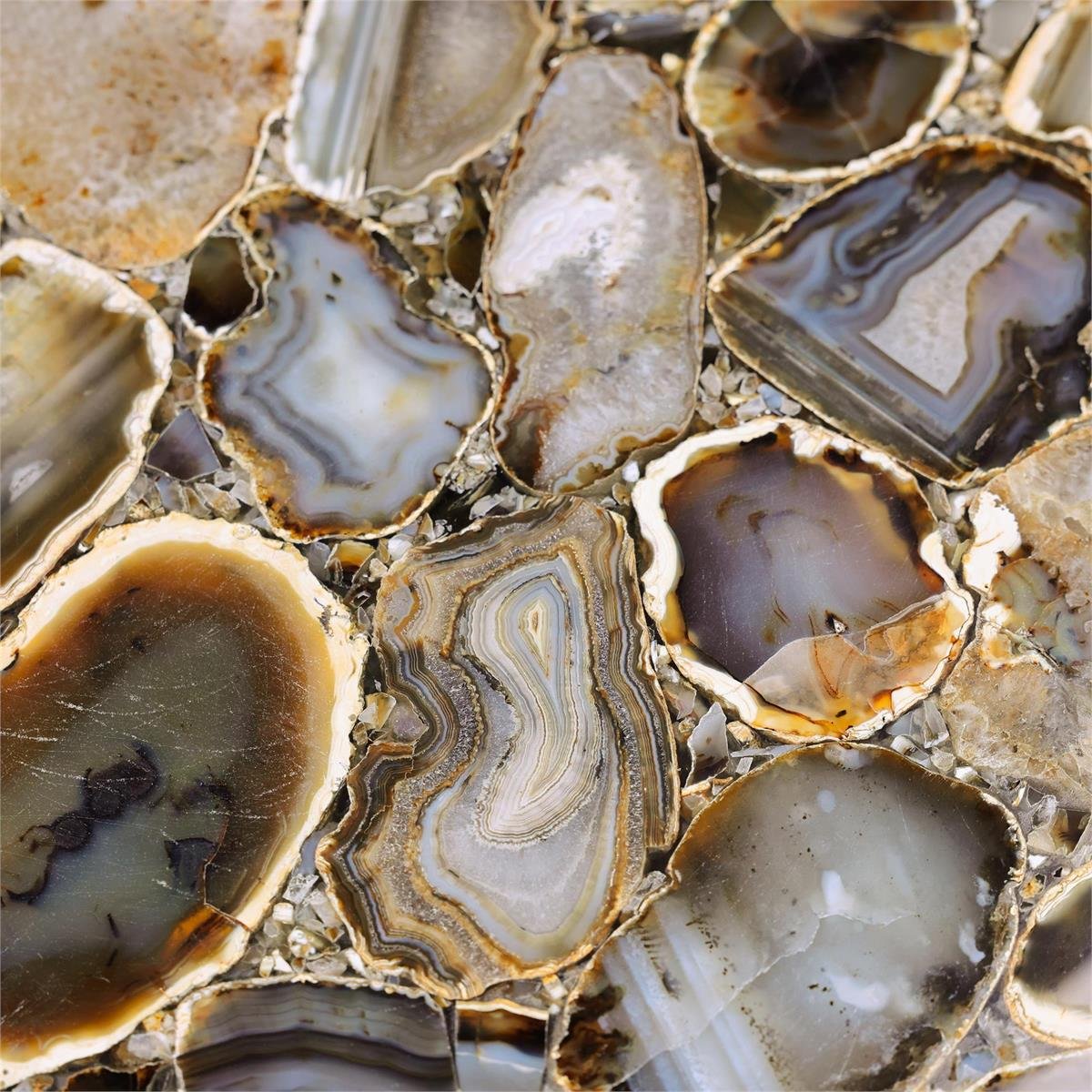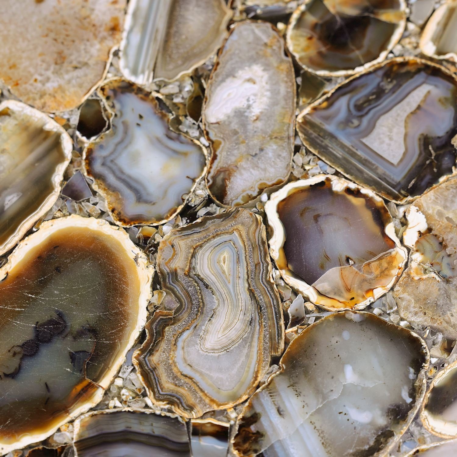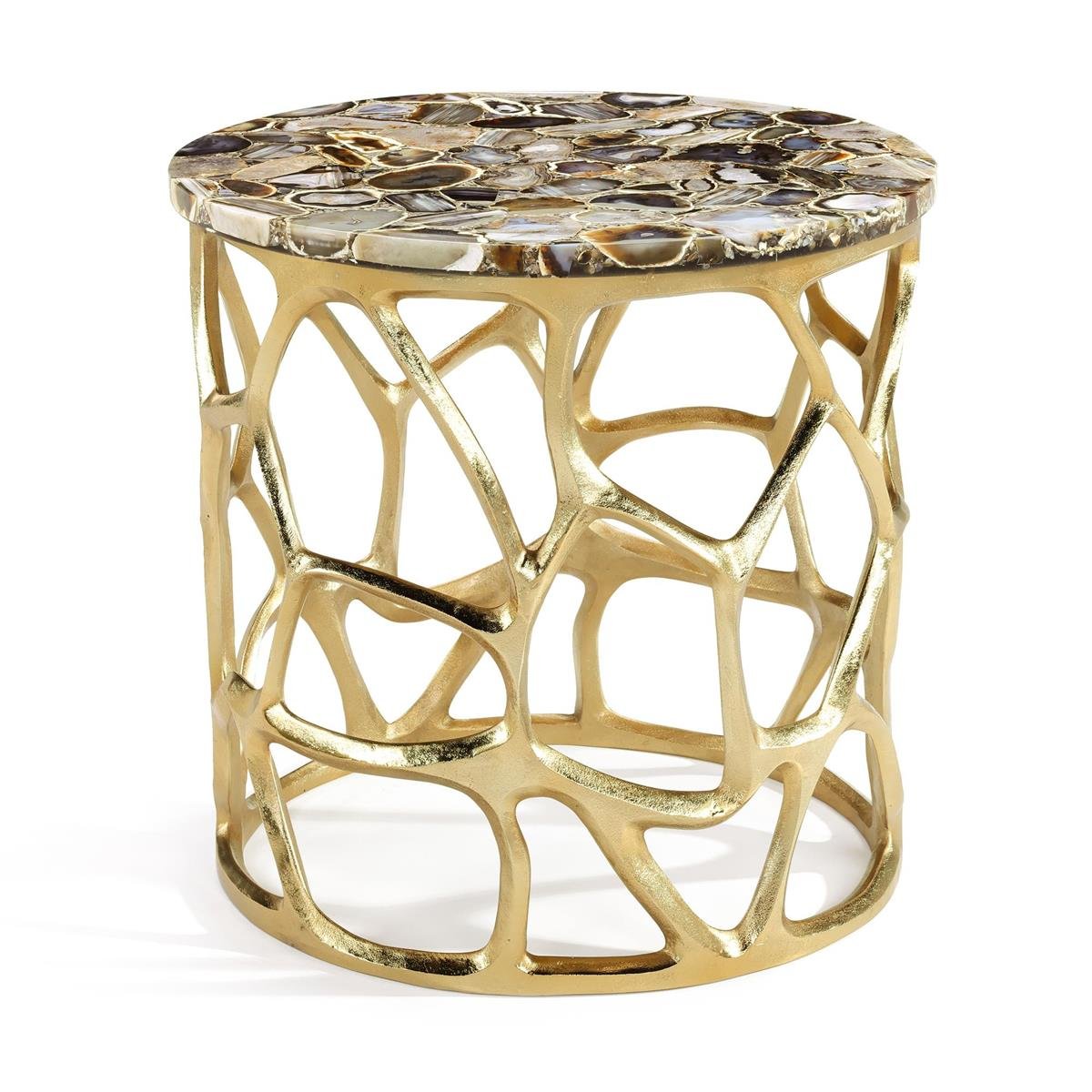 The Renata Side Table showcases a harmonious fusion of natural materials and contemporary design. A rounded agate tabletop in striking natural tones is supported by an organically shaped aluminum base in Brass. The unique design of the base showcases a tasteful use of negative space, contributing a wealth of visual interest.
