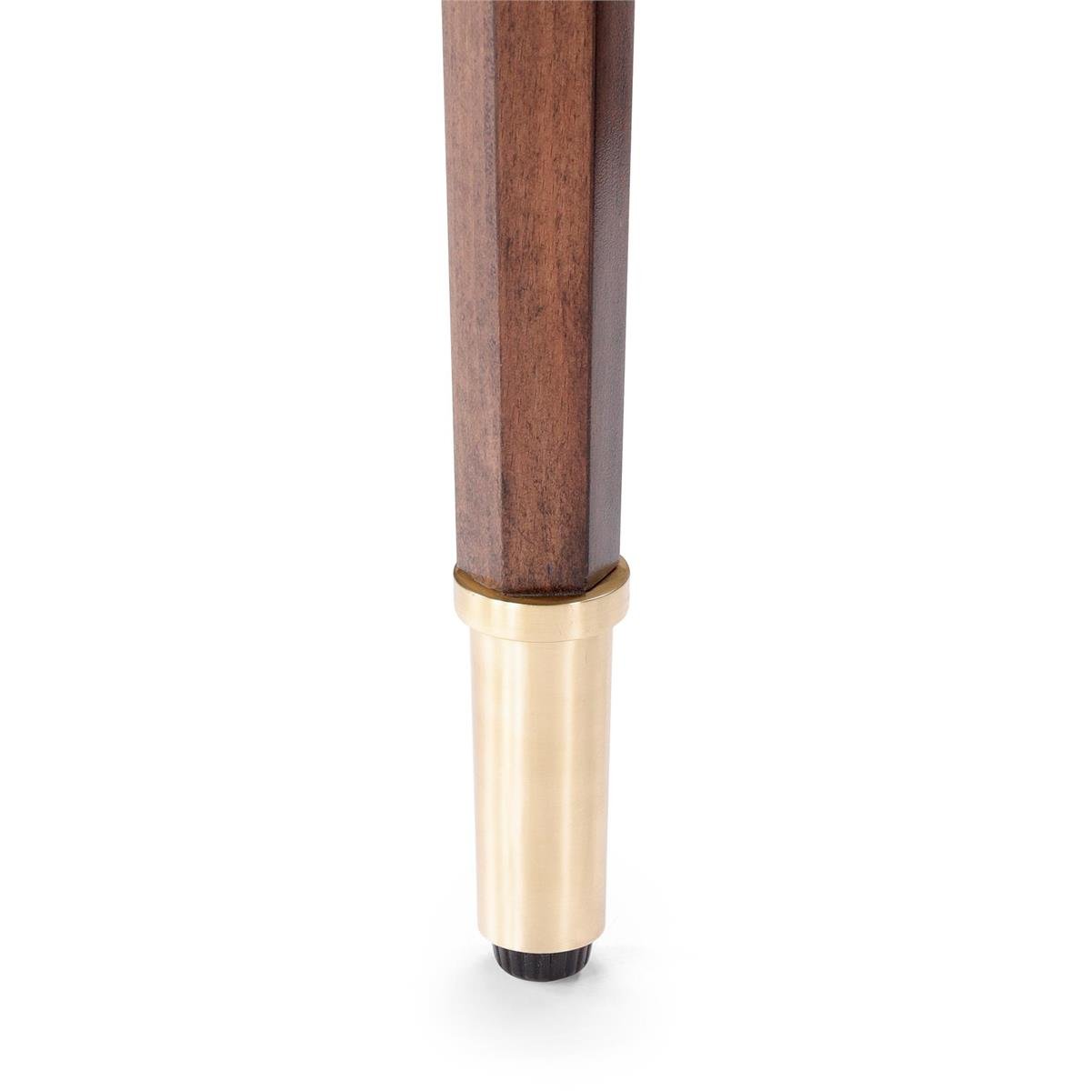 The Riverton Console Table is a stately design with a slender profile. Crafted from eucalyptus wood in a Monopoli finish, the piece showcases a natural tone enhanced by Polished Brass trim and a refined display of chevron patterns beneath the rounded tabletop. Four slender, tapered legs feature sculptural detailing and Polished Brass feet, completing the look.