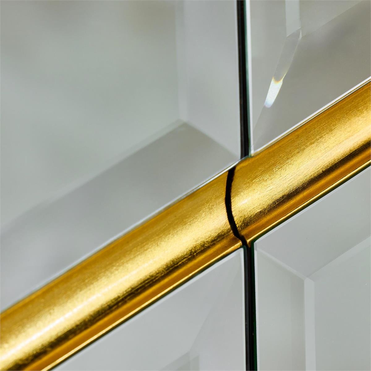 The Ronin Sideboard is a sharp, sleek offering that exudes contemporary charm. An oak wood frame in a Smoked finish contains six doors adorned with beveled mirrors, featuring dimensional striations at varying angles in an Exotic Gold finish. The sideboard sits atop six elegantly tapered legs and features three interior compartments with adjustable shelves.