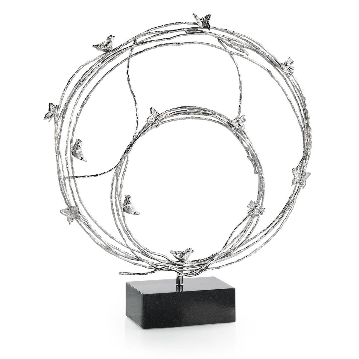The Roost Sculpture is a magnificent tabletop accent that displays gorgeous natural motifs. Crafted from brass in a Nickel finish, several birds and butterflies perch atop an alluring loop of sinuous branches. This stunning piece rests atop a square base of black marble.