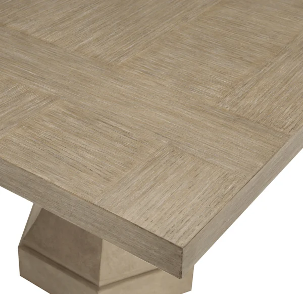 Traditional style meets California cool in the Santa Barbara rectangular dining table. Casual and welcoming, it features a fancy face top with wire-brushed, cerused oak veneers in a warm Sandstone finish. The veneer pattern accentuates the subtle textures and lighter strokes of color in the grain. A hexagonal faux stone pedestal base is presented in a complementary Textured Cameo finish, rounding out the fresh, neutral color palette.