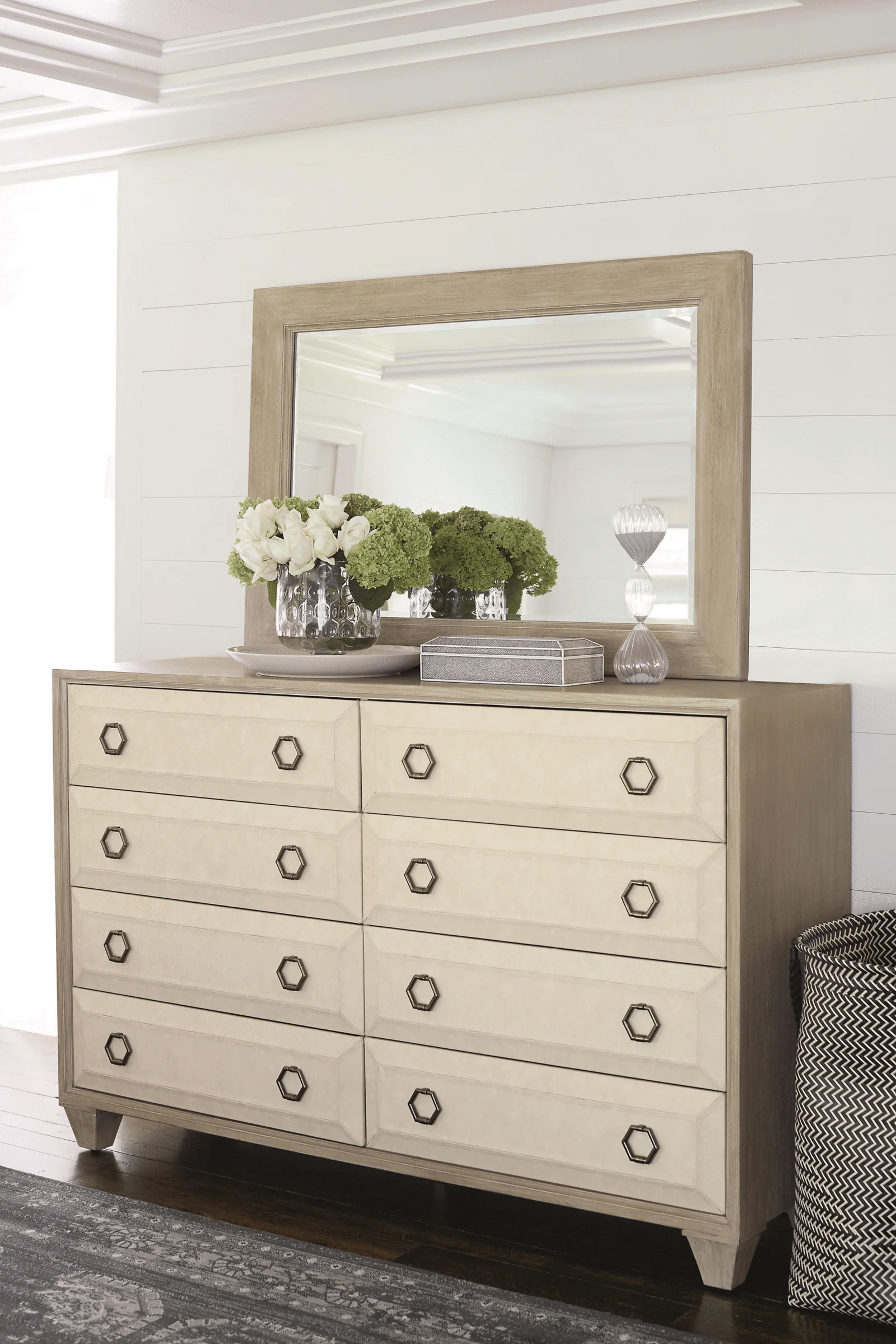 As cozy as it is couture, this dresser features drawer fronts wrapped in faux leather fabric accented by Vintage Nickel pulls.