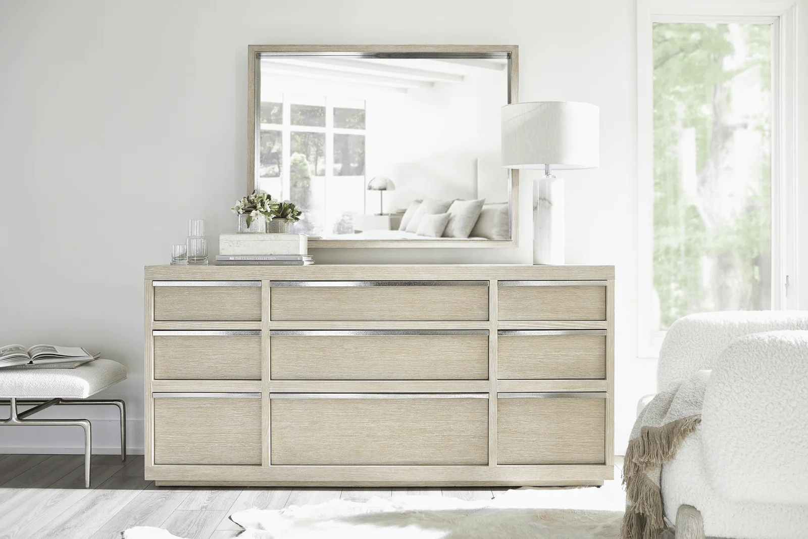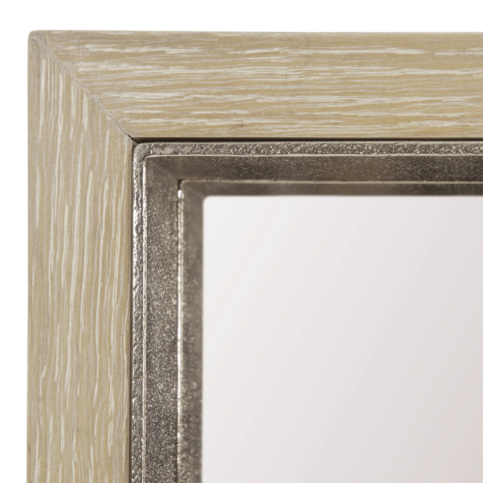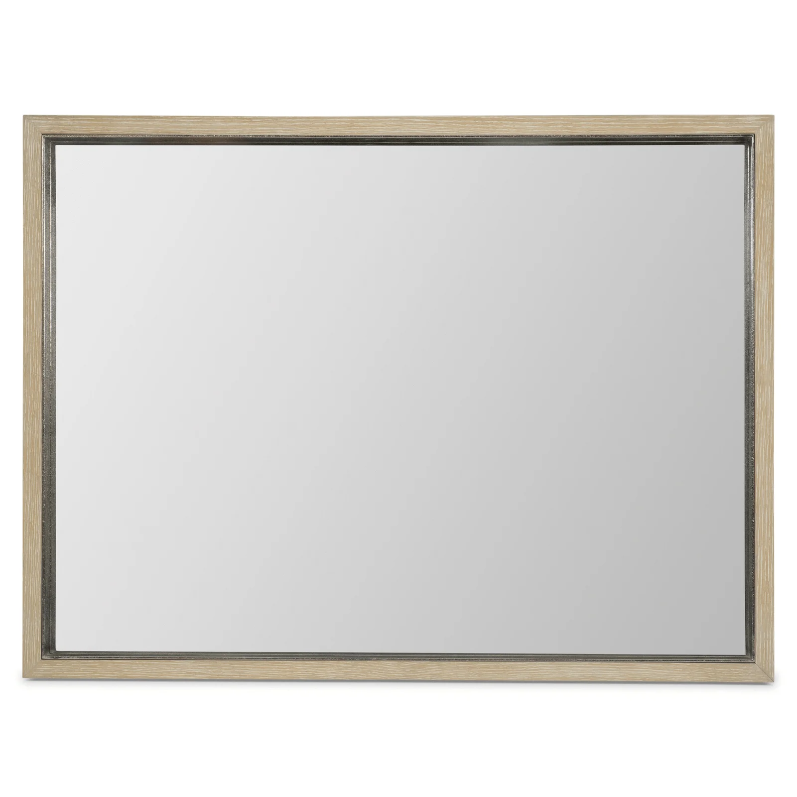 The Solaria mirror is crafted with an exterior wood frame in the Dune finish and an inset cast aluminum frame in Shiny Nickel. The mix of materials creates a distictive design that can be hung horizontally or vertically.