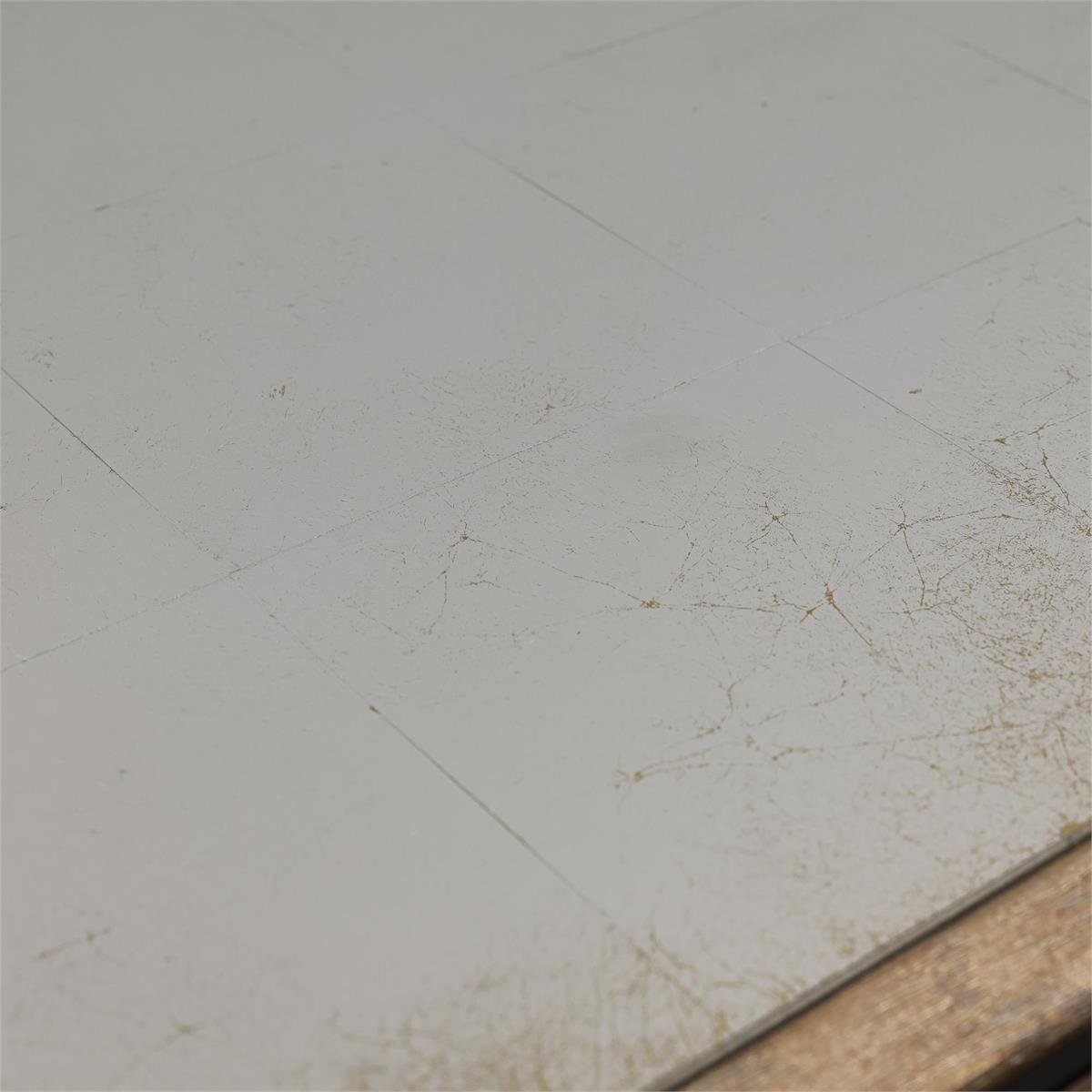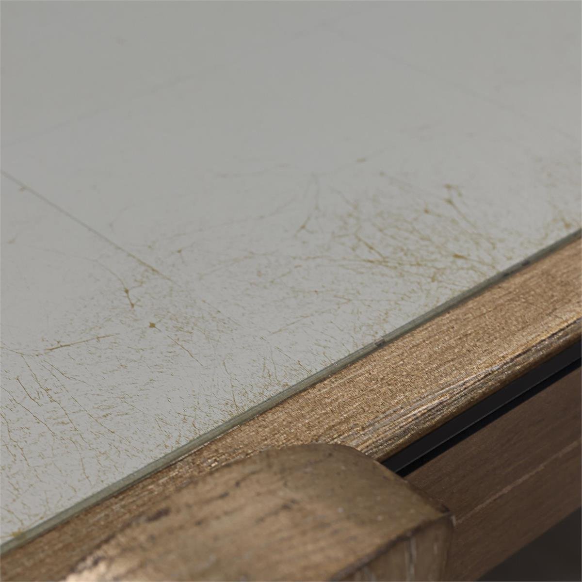 The Soleil Four-Door Credenza is crafted from oak veneer in a Gold White finish, its curved silhouette defined by vertical fluting that lends the piece a sculptural presence. The design is anchored by bronze tempered glass doors beneath an eglomise glass top with a distressed gold backdrop. Slender stainless steel handles in a Brushed Brass finish form a striking focal point along the central doors, their elegant contours standing in stylish contrast to the vertical fluting. The interior features dimmable LED lighting, a central compartment with an adjustable shelf, and two outer compartments with fixed shelving. Adjustable glides are included for ease of placement.