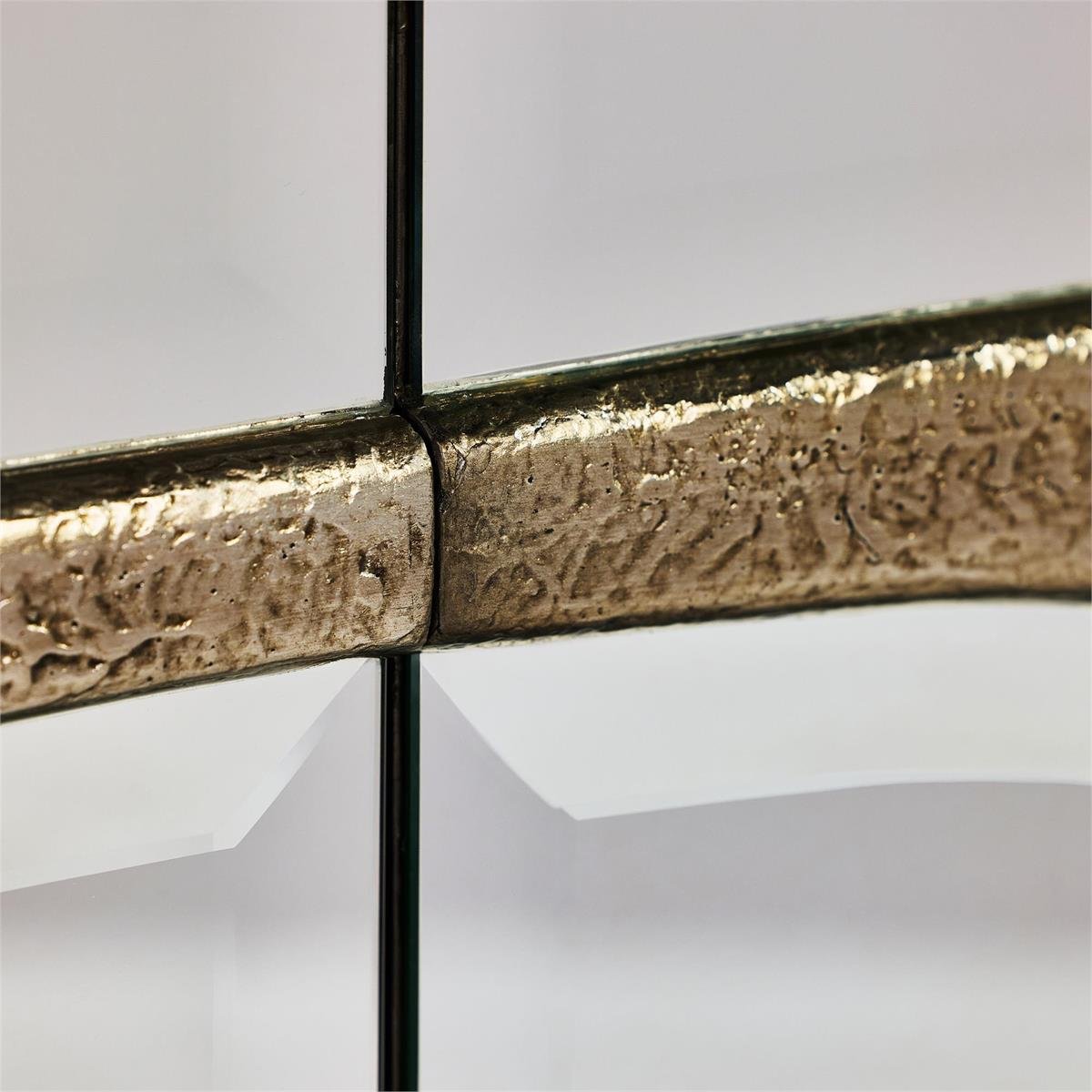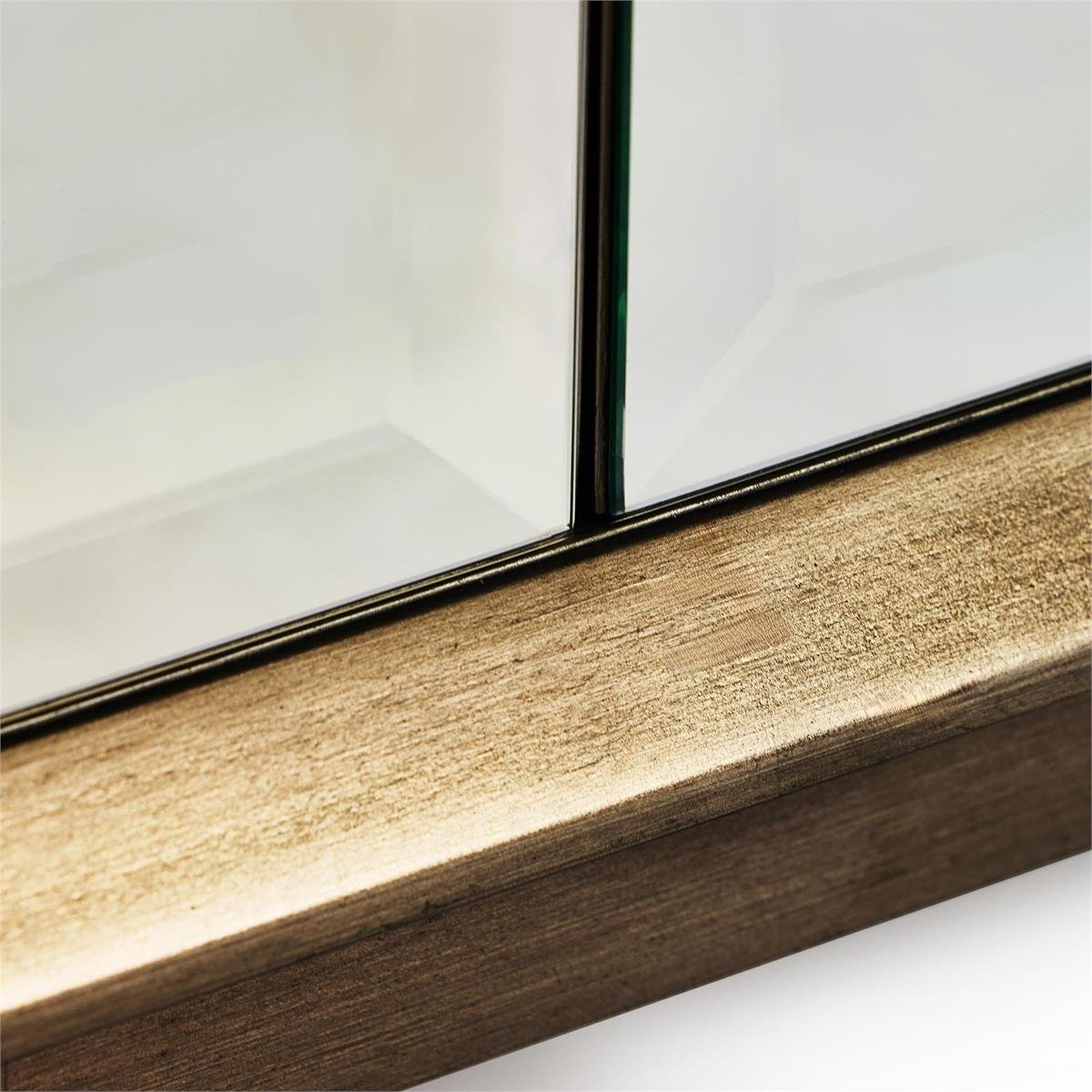 The Stride Cabinet is a sleek design statement that exudes contemporary charm. The square frame is crafted from beech, ash, and celtis woods and shown in a Driftwood finish, showcasing stylish neutral tones. Two cabinet doors are affixed with beveled mirrors overlain with an angular motif in Antique Pewter, contributing a wealth of textural depth. Accent trim along the front edges and a base with four legs, also in Antique Pewter, complete the look. This gorgeous cabinet features a single interior compartment with an adjustable shelf.