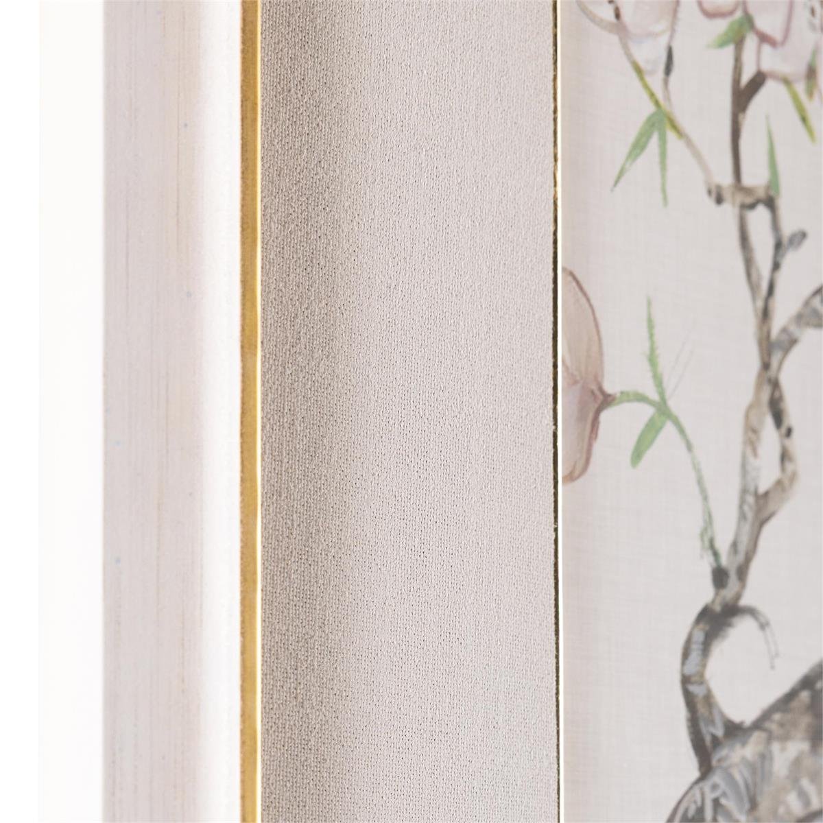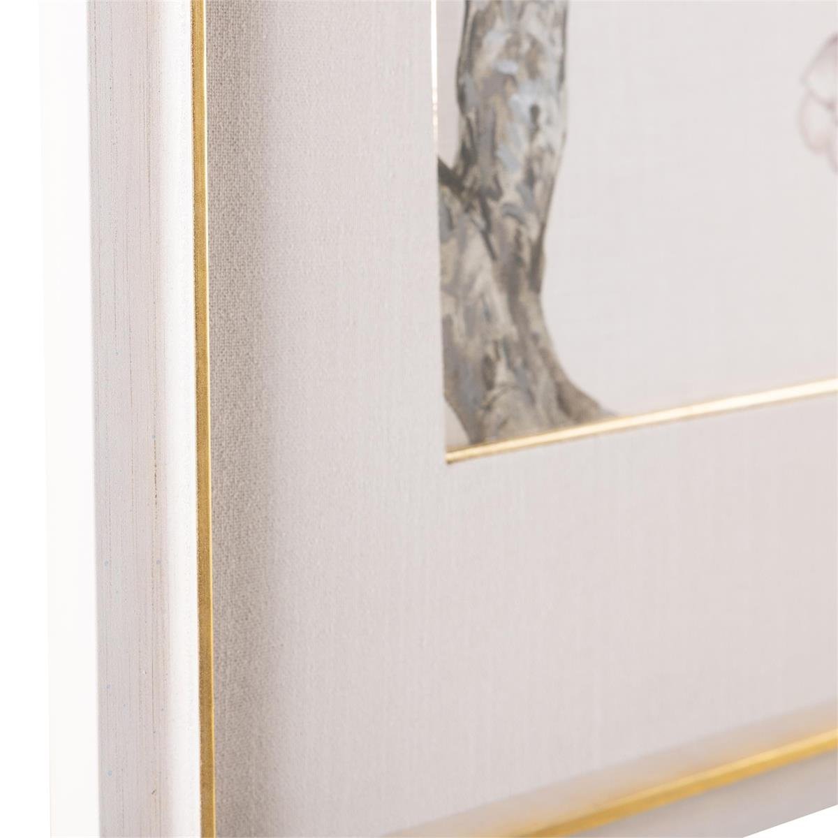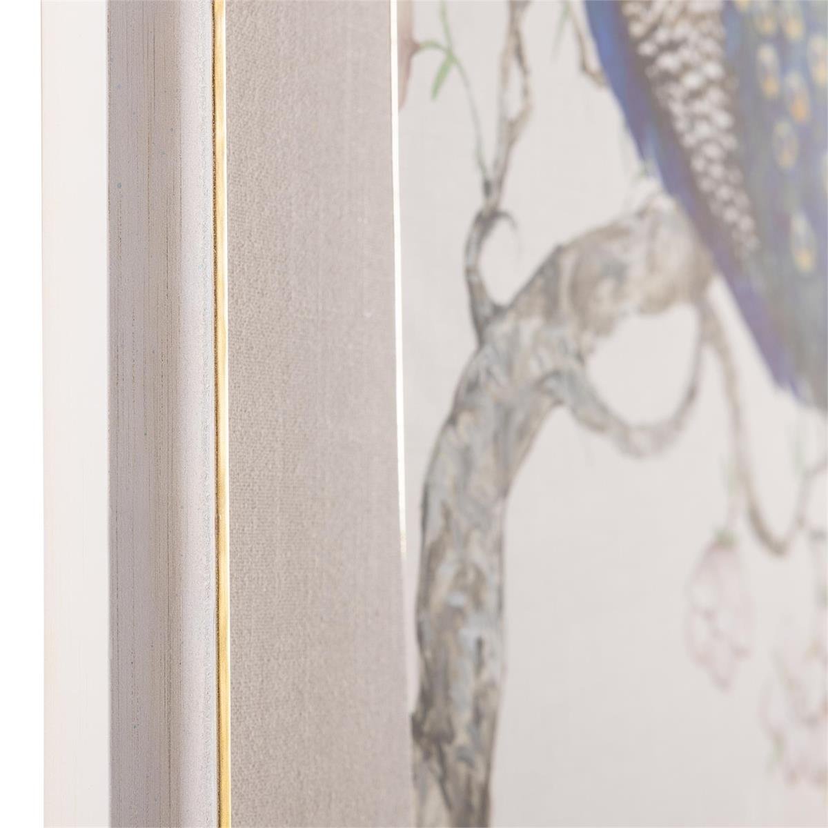 Peacock and Blossoms by artist Tim O’Toole is a stunning print on watercolor paper that introduces an interior space to tranquil motifs from nature. The composition showcases an elegant peacock that gently rests upon winding branches with delicate white florals. The piece is held within a distressed gallery frame with gold trim, matching the hand-painted linen mat and gold leaf filet. This beautiful artwork is designed for horizontal display only.