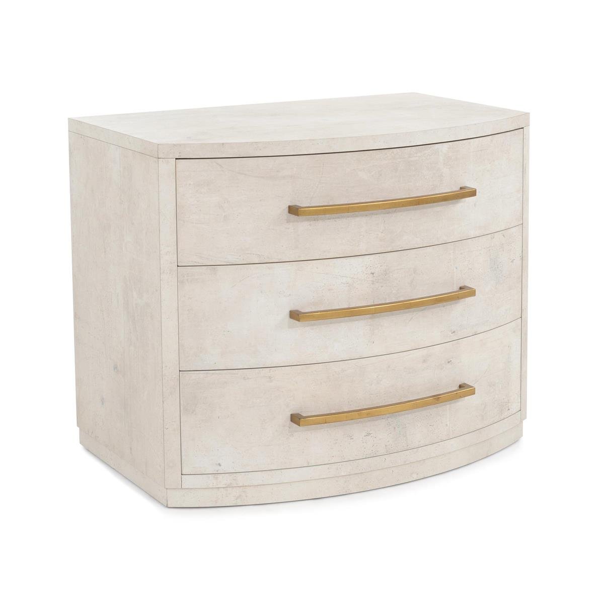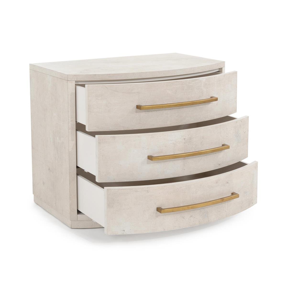 This three-drawer nightstand with an elegant, curved front is finished in tiza gesso. It features soft-closing drawers with elongated, curved handles in antique gold.