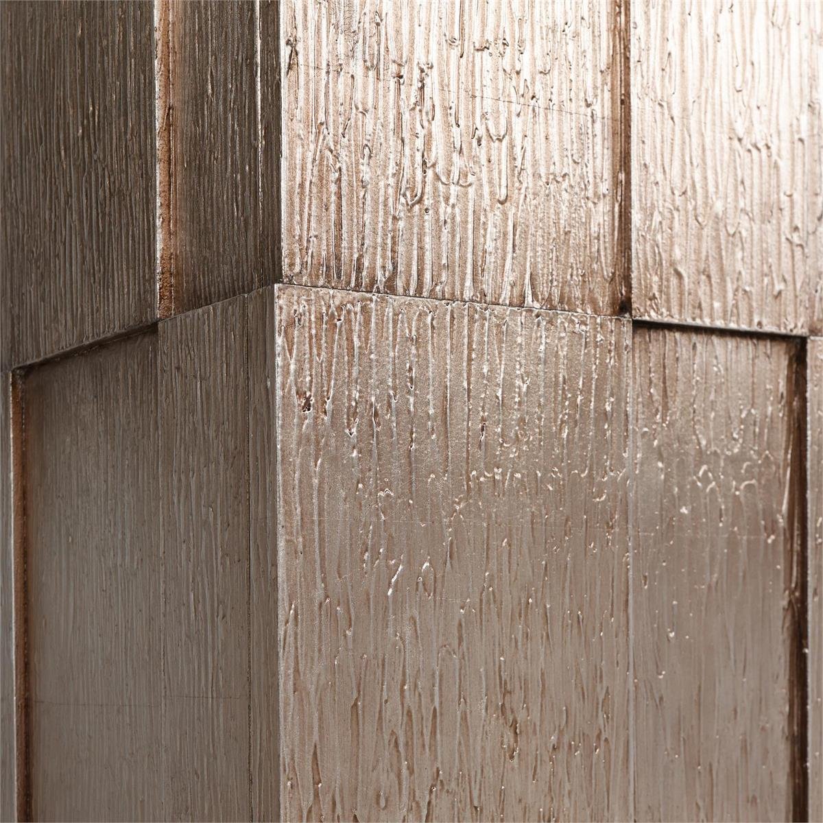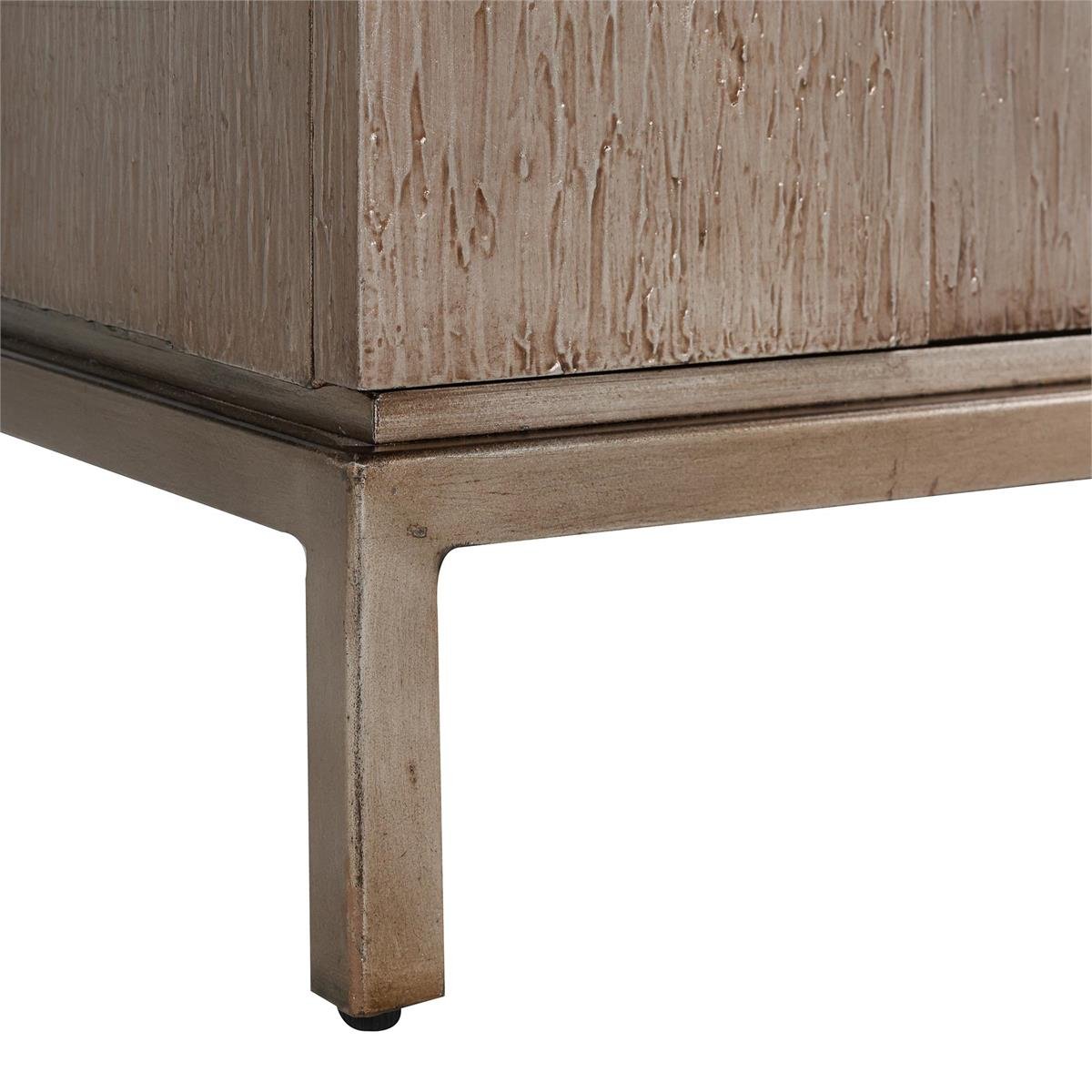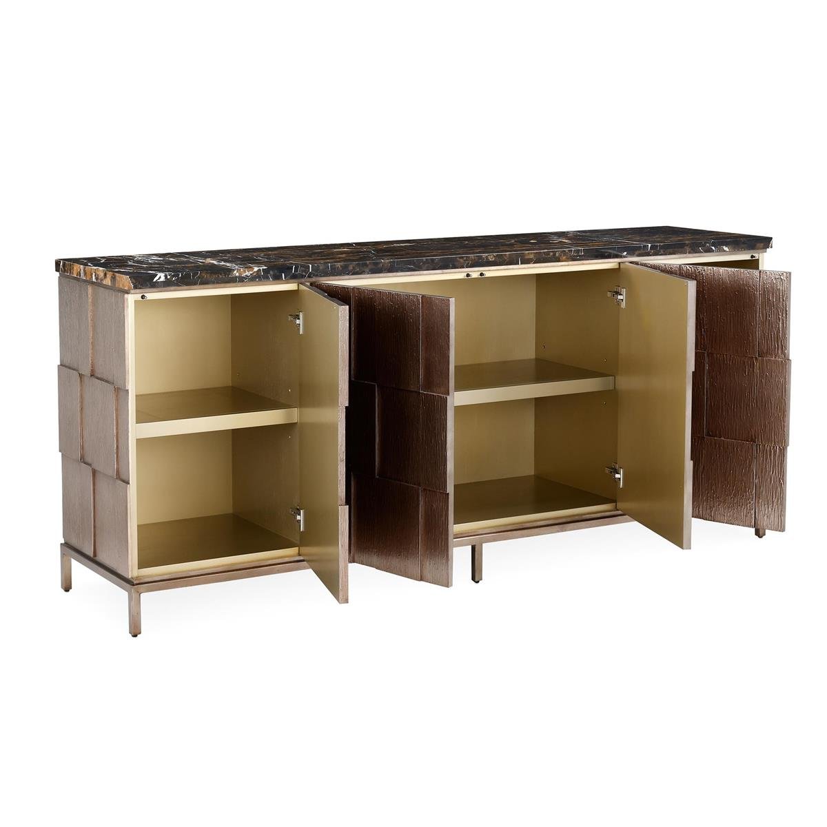 The Vigil Four-Door Sideboard is defined by its dimensional composite detailing and matching steel base in an Argentum finish. The relief is arranged in a staggered block pattern that brings depth and sculptural rhythm to any setting. A polished Portoro marble top crowns the piece, its dark veining offering a striking counterpoint to the cool silver tones below. The interior features quarter celtis veneer in a Silver Powder finish, including. three compartments with adjustable shelving. Adjustable glides are included for ease of placement.